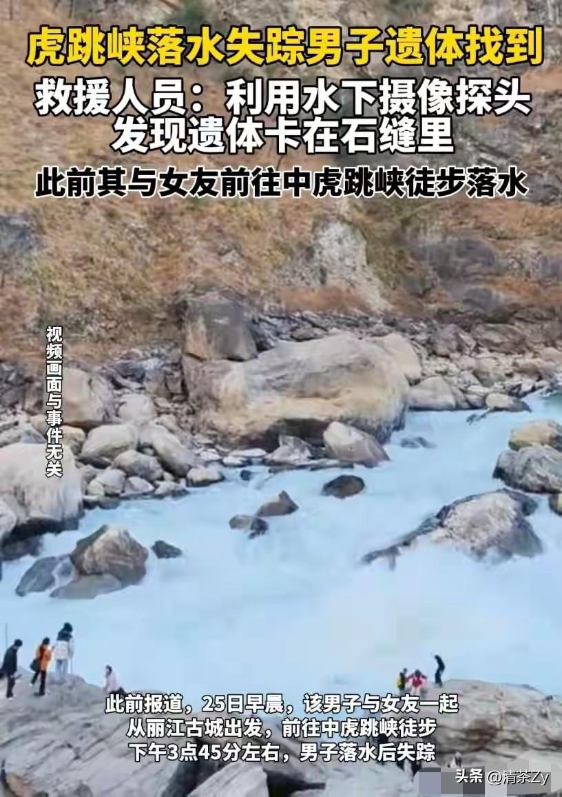 本来准备今年结婚的,没想到29岁的生命永远定格在了虎跳峡那湍急而又冰冷的河水中! 山东枣庄小伙利用春节假期带着女朋友来到云南拍摄婚纱照,两人准备拿到婚纱照后就筹办婚礼! 婚纱照拍完后,两人也准备在云南多玩几天,毕竟来一次不容易! 2月25日两人来到了虎跳峡风景区,湍急的河水边有一块石头叫做“发疯石”很多游客都在排队准备在石头上拍照留念! 这时小伙子拿的水杯不小心掉进了石头缝里沾了些灰土,于是他就拿着水杯到水边去清洗,结果脚下一滑就掉到了水里! 女友一边拿登山杖希望能把男友拽上来,一边使劲地呼喊救命,只可惜水声太大了没有人能听得见!很快,整个人就被湍急的河水淹没了! 多支救援队赶到现场进行救援,但结果都不是很理想,找到了那支登山杖还有要清洗的不锈钢水杯,以及小伙子穿的外套!唯独没有找到人! 直到9天后,搜救人员才在离落水处不远的五米深的大石头缝中找到该男子!虽然男子已找到但是救援难度却很大,的需要有人下去协助才能打捞上岸! 婚纱照都已经拍好,亲戚朋友们都等着喝喜酒了,没想到却发生了这样的悲剧!不管什么时候 自身安全才是最重要的!