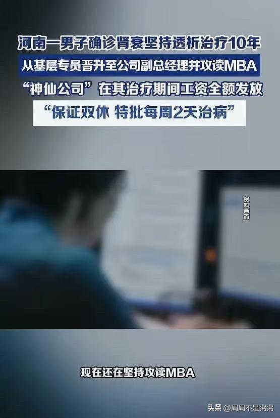 “越努力越幸运!”河南郑州,一男子27岁时被确诊为肾衰竭,从此开始了透析治疗之路,十年来,他没被病情击垮,反而从一名普通专员逐步晋升为公司副总经理,如今还在攻读MBA,男子感慨没有因为生病拖累父母!网友:吾辈楷模! 二十七岁,本该是人生大步向前的年纪。刘先生却拿到一张肾衰竭的诊断书。这意味着,他的余生将与透析机紧密相连。每周两次,每次四小时,血液被引出体外,过滤,再输回去。这个过程,他得坚持一辈子。 很多人觉得,人生到这里,可能就慢下来了,甚至停摆了。但刘先生没有。透析室成了他另一个“办公室”,治疗间隙,他看书,处理工作。他把时间掰成两半用,一半对抗疾病,一半追逐事业。 他所在的公司知道他生病后,公司给了最大的支持,双休保证,每周二、周四下午特批他外出治疗,工资一分不少。公司相信,一个能扛住病痛的人,也能扛起工作的责任。 从2013年毕业入职做专员,到如今的副总经理,这条路他走了十多年。疾病没有成为他懈怠的借口,反而成了鞭策的动力。他不想成为任何人的负担,尤其是年迈的父母。那份“不拖累”的坚持,背后是沉甸甸的责任和自尊。 如今,他还在攻读MBA,继续给自己充电。他说:“越努力越幸运,更幸运的是遇到个好单位。” 这句话道出了这个故事的真谛。刘先生的经历告诉我们,疾病可以限制身体,但无法定义一个人的价值和未来。 一个有温度的公司不只有KPI和制度,还能在员工遭遇风雨时,能递上一把伞,说一句“别怕,我们等你”。这种支持,能让一个身处逆境的人,爆发出惊人的能量。 人生无常,我们无法选择会遭遇什么风暴。但我们可以选择面对风暴的态度,也可以选择成为他人风暴里的一处港湾。努力的人值得被善待,而善待努力者的地方,也必将收获更多的忠诚与创造。 各位读者你们怎么看?欢迎在评论区讨论。