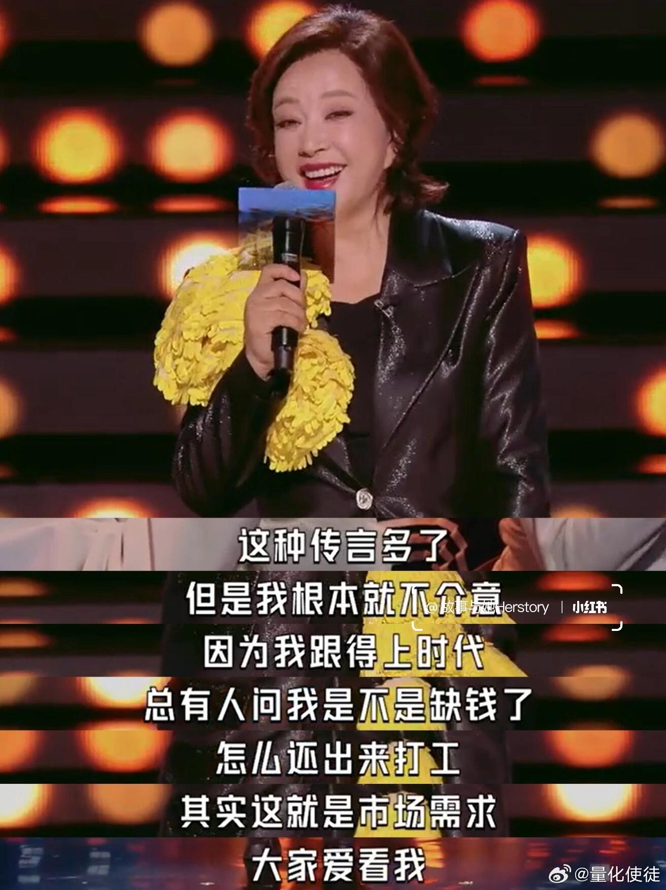 刘晓庆这种女人,时间拿她一点办法都没有❗我宣布刘晓庆老师就是我的反焦虑精神导师!最近在节目里又看到她的脱口秀,状态好到让人完全不敢相信是74岁。一身黑色亮片外套配上巨型花朵,手持话筒往那一站,气场全开。看完只想说:这个女人,活得也太!通!透!了!🔥关于总是有各种绯闻,她直接笑着甩出一句:有绯闻,还不是因为我漂亮。(配上她那个招牌的、略带傲娇的表情)面对非议,她没有丝毫自证和拧巴,反而用一种近乎完美的自信,把“问题”变成了对自己魅力的肯定。这种稳到极致的核心自信,是多少人一辈子都练不出来的。💡总有人问她:是不是缺💷了,怎么还出来打工拍短剧?她的回答清醒又霸气:其实这就是市场需求,大家爱看我,因为我跟得上时代。她太清楚了——她的价值,从不取决于“需不需要赚💷”,而在于“市场是否还需要我,观众是否还喜欢我”。从电影女王到短剧、综艺、脱口秀,她不是在掉价,而是在不断踏入新的战场,证明自己在任何时代都有“被需要”的价值。这才是真正的乘风破浪。🌟更让我触动的,是她对年龄的态度。她说,媒体总爱写“74岁的刘晓庆”,她一开始觉得名字被加长了,但现在:“我就很乐意接受这个称呼了。”“因为这个年龄,不但没有成为我的负担,反而让我得到了更多的肯定。”“只要提一下我74岁就够了…我现在就是风华正茂,正当年华。”她没有丝毫对衰老的恐惧,只是坦荡地拥抱了数字,并重新定义了它——74岁,不是衰落,而是阅历加持下的正当年。刘晓庆让我们看到,真正的风华正茂,与年龄无关,只与状态有关。看着她在台上侃侃而谈,你会忘记那些她曾登顶的辉煌,和后来坠入的谷底。她像一棵树,风雨在她身上刻下年轮,也让她扎根更深,枝叶更茂盛。刘晓庆给我们所有女孩上了一课:真正的强大,是接纳所有经历。高峰与低谷,都是养料,最终内化成一句“什么都不放在眼里”的底气。外界的定义,从来困不住一个内心自由的人。价值感,来源于“我乐意”。不管是演戏还是“打工”,内核稳定的人,做什么都是在享受自己的生命。她不是冻龄女神,她是用一辈子,活出了好几生的浓度和宽度。这种女人,时间拿她一点办法都没有。