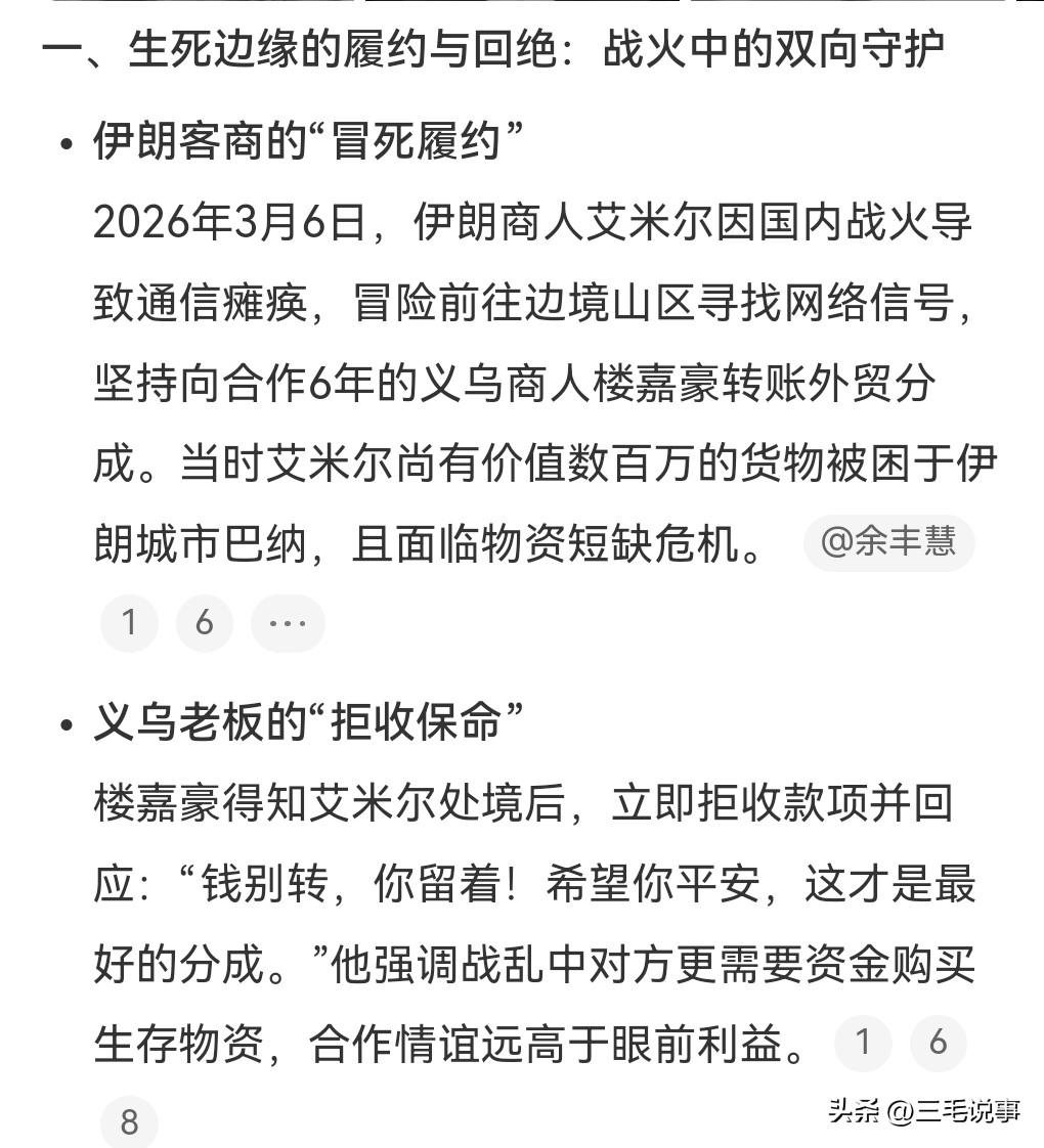 这个伊朗商人真的是太有诚信了,冒着生命危险把钱转给义乌的合作伙伴。 3月6日,伊朗客商冒战火转账被义乌老板拒收。 义乌老板说:你平安就是最好的分成。 这真的是太让人泪目了。 一个是重诚信的人,一个是好人。 希望美国和以色列停止侵略伊朗,还伊朗太平。
