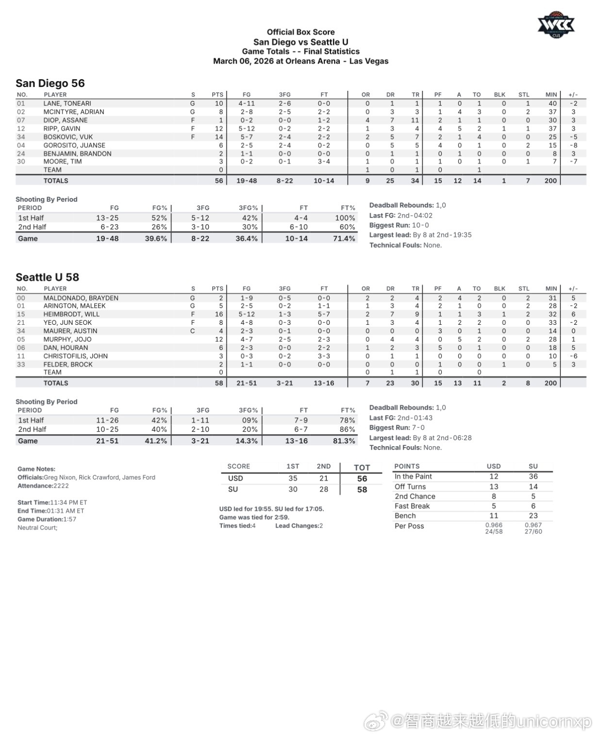 WCC锦标赛第二轮西雅图58比56击败圣地亚哥晋级下一轮,淡厚然出场19分钟得到6分3板,犯规还是老问题淡厚然NCAA