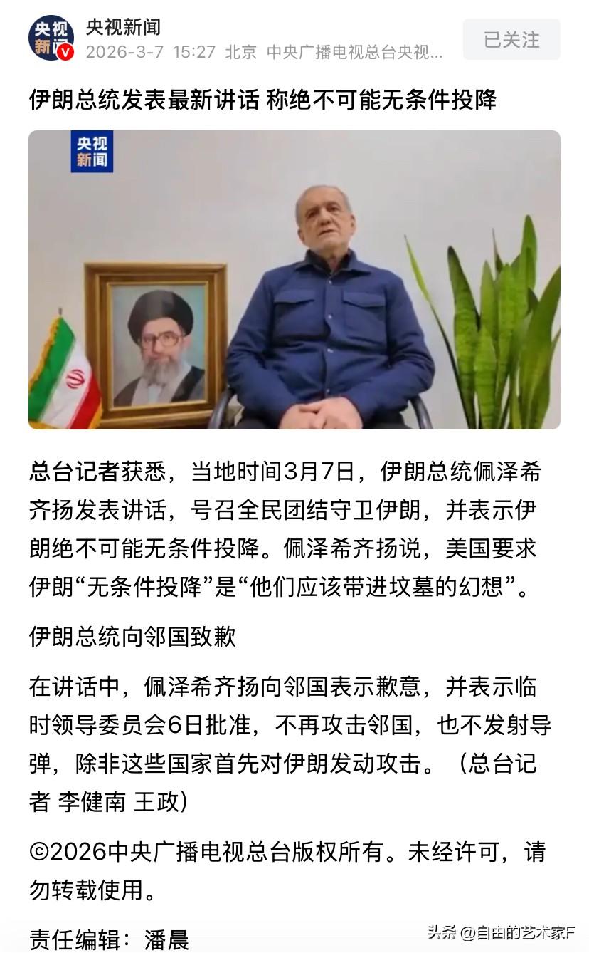 果然中俄的话,伊朗听进去了,向邻国致歉,专打以色列,但有一个条件 中东冲突来到了第八天,战局依旧非常的胶着,伊朗在七个小时之内,连续朝以色列发射了五轮导弹。以色列的回击也不手软,在伊朗打击过后,起飞了八十架以色列战斗机,对德黑兰和伊朗中部地区进行了又一次的打击。 位于德黑兰梅克拉巴德国际机场,属于重点被打击的地方。多架客机被毁,该机场是伊朗国内最大的国际机场。对伊朗的影响也是至关重要的。 除此之外,在伊朗攻击以色列的时候,阿联酋上空出现了拦截行动,导致迪拜国际机场传出爆炸声,目前所有往返迪拜的航班已经被暂停。 从开战到现在,伊朗为了打击美军基地持续的攻击中东几个国家,导致这些阿拉伯国家非常的不满,耐心也已经到了极限,多次向伊朗发出警告,如果不停止轰炸的话,那么他们将进行反击。 介于阿拉伯国家的压力,以及中俄多次提醒伊朗关注邻国诉求,就在刚刚伊朗总统佩泽希齐扬发表讲话,称伊朗人绝对不会投降的。同时在开战之后。伊朗首次向邻国表达歉意,称后续他们不会再向邻国发射导弹和无人机。但是有一个前提,那就是这些海湾国家不能主动攻击伊朗 对于该事件我们是怎么看的?此刻的伊朗承受着巨大的压力。如果在持续打击美军基地的话,那么会引发中东国家的不满,在加上现在美国在中东境内的雷达系统,基本上已经被摧毁,预警系统大不如从前,提高了导弹的命中率,现在伊朗向周边国家示好是一个非常好的时机。