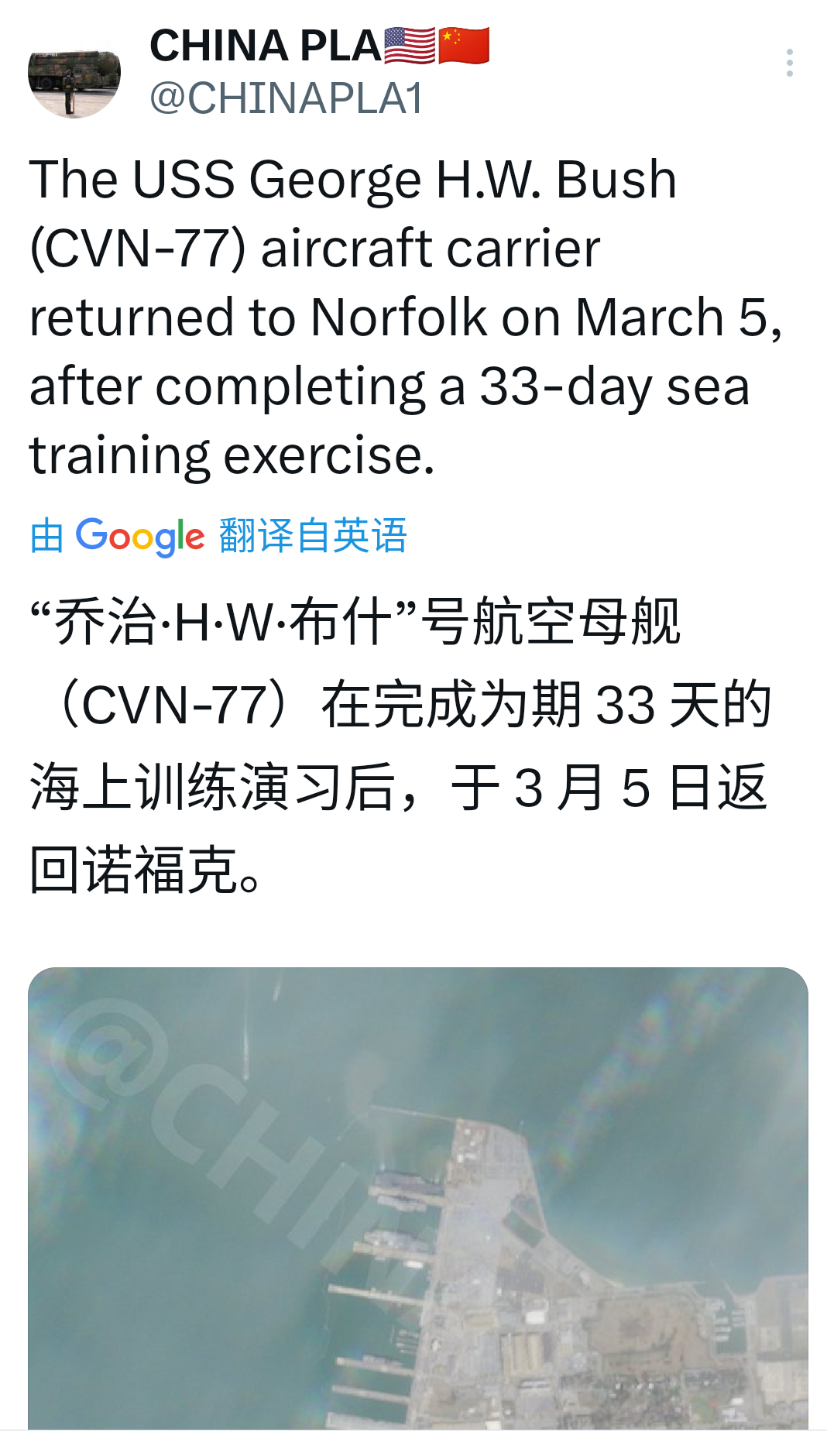 乔治·H·W·布什号航空母舰(CVN-77)在完成为期 33 天的海上训练演习后于 3 月 5 日返回诺福克。美伊以冲突中东现场直击烽火问鼎计划