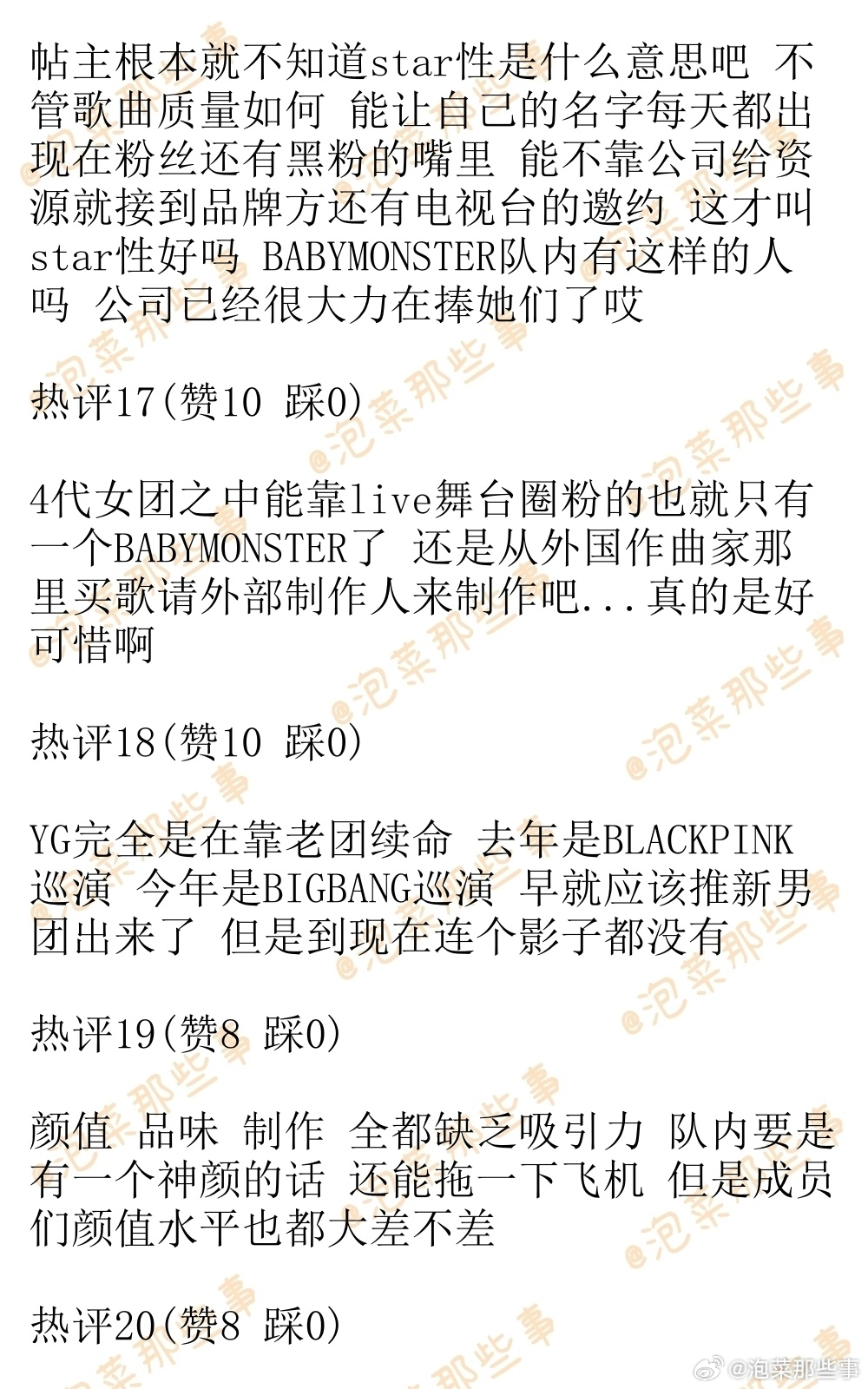 🔥韩网热帖评论翻译🔥BABYMONSTER这个组合真的是太可惜了...韩网原帖帖主称:全员实力都在线 也有star性 颜值也很能打 但是制作实在是太老土了..别家女团的概念风格都很符合2026年当前的潮流 但是BABYMONSTER每次回归都让人梦回2010年代...WE GO UP一看就知道是从猎魔女团那里得到的灵感 太没品味了真的cr.pann