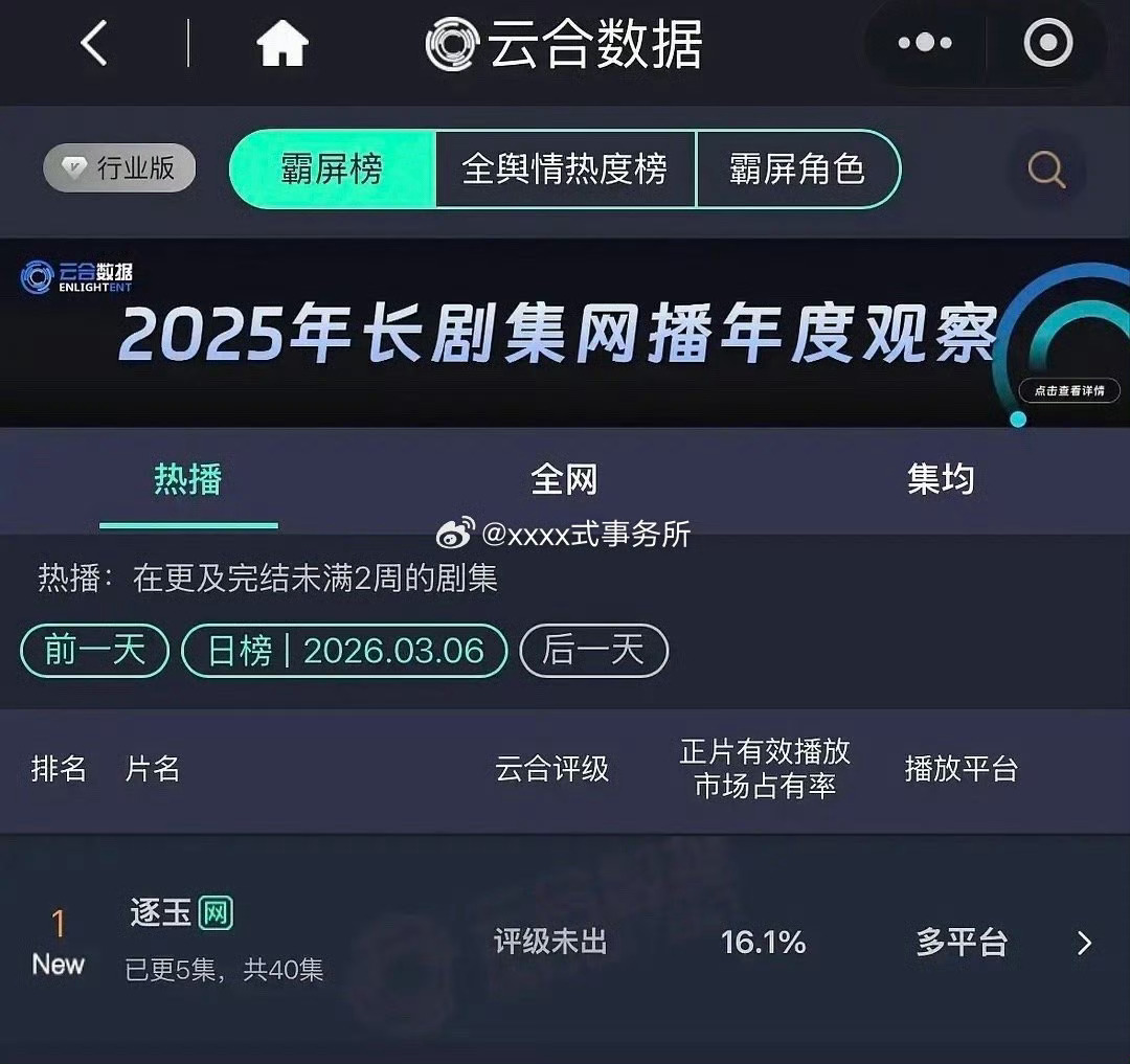 逐玉和赴山海都是双平台联播,首日云合都是16%+,还挺巧。但是赴山海第二天口碑就崩了,太多吐槽,后劲没跟上。还有十几分钟逐玉就开播了,成败就在今天的口碑了!逐玉首日云合 *逐玉编剧 豆瓣打分