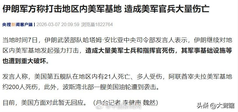 【伊朗袭击美军军事基地致200多人死伤】 据伊朗军方发布的消息表示,伊朗袭击了美军第五舰队基地和阿联酋宰夫拉美军基地,有200多美国士兵在此次袭击中死伤。 消息称,美军第五舰队至少有21人死亡,其中包括第五舰队司令官,阿联酋军事基地有200人死伤。 目前,美国并未就伊朗此次袭击作出任何回应,如消息属实,美国这一次损失就很大了。