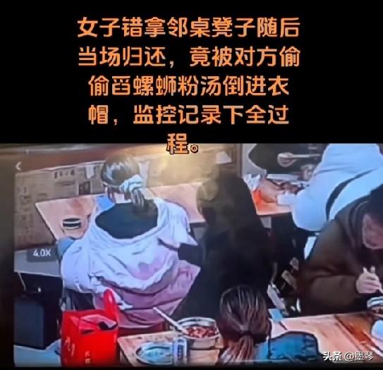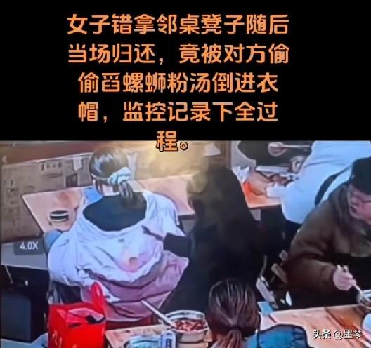 就因为邻座的姑娘拿错了她坐过的凳子,黑衣女子就拿油汤泼人家衣服,这心眼小的比针眼还小。 事情的起因是3月5日晚,在河北保定一家螺蛳粉店内,当事人因店内人多,误拿了黑衣女子的凳子坐下。发现后立刻当场归还,并解释是以为没人坐,还叫服务员重新给自己拿了一个凳子。 但黑衣女子对此却不依不饶,当场辱骂当事人,双方发生口角,经店员劝阻后才暂时平息。 然而,看似平静之后,黑衣女子又趁当事人低头吃饭毫无防备,竟用勺子多次将滚烫且有油污的螺蛳粉汤,偷偷舀进当事人的衣帽里。 拿错凳子只是无心之失,且已及时纠正。对方却因为几句口角,就选择在背后用这种下作、阴暗的手段报复,不仅弄脏了衣物(油污极难清洗),汤汁还可能造成烫伤或健康问题。 从监控中能看到,她泼完汤后还能若无其事地继续吃粉,仿佛什么都没发生。这种当面一套背后一套的行为,暴露了其内心的极度自私与缺乏教养。 吃个饭而已,为了一个凳子搞这么大的恶意报复,这心胸确实狭窄到极致了。