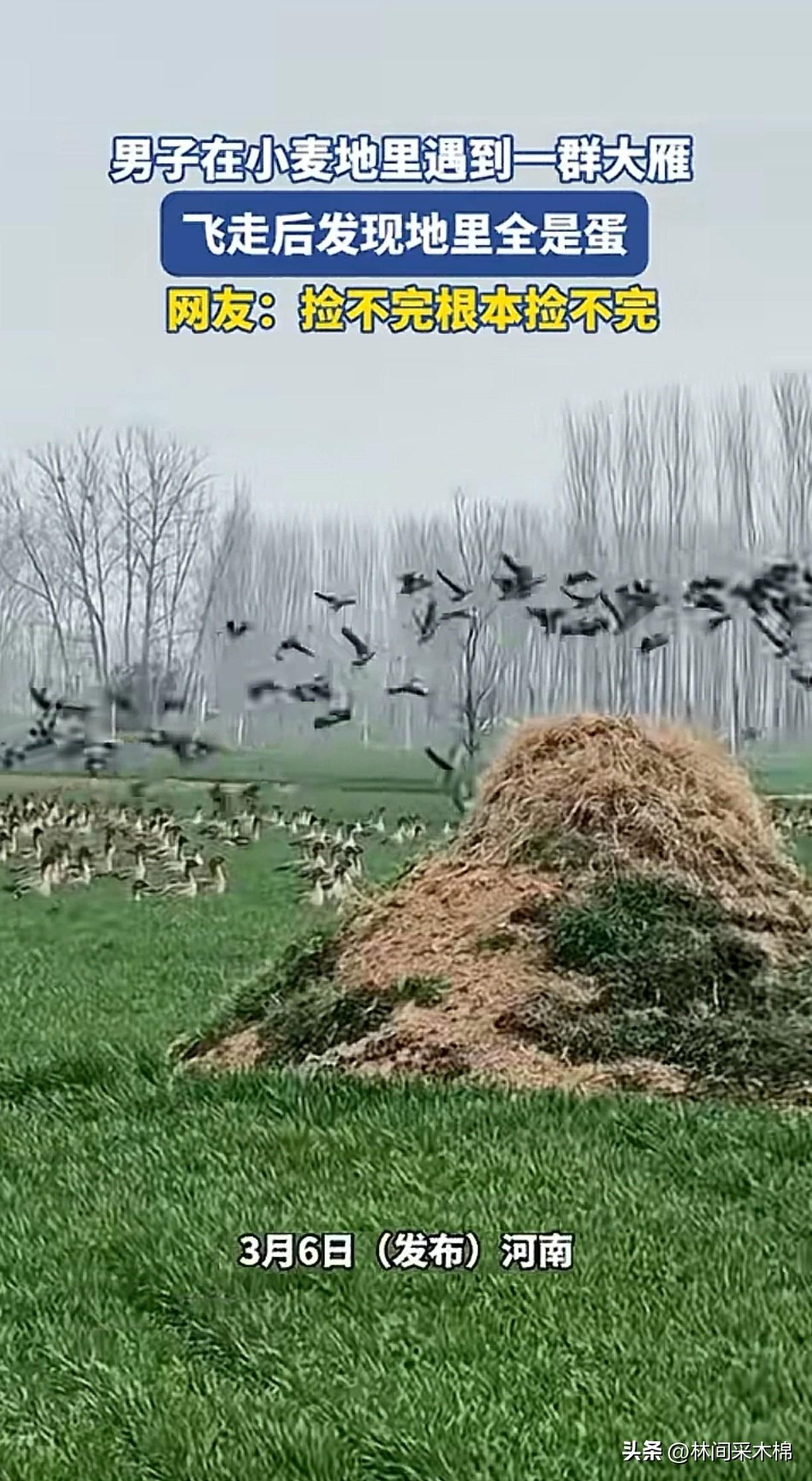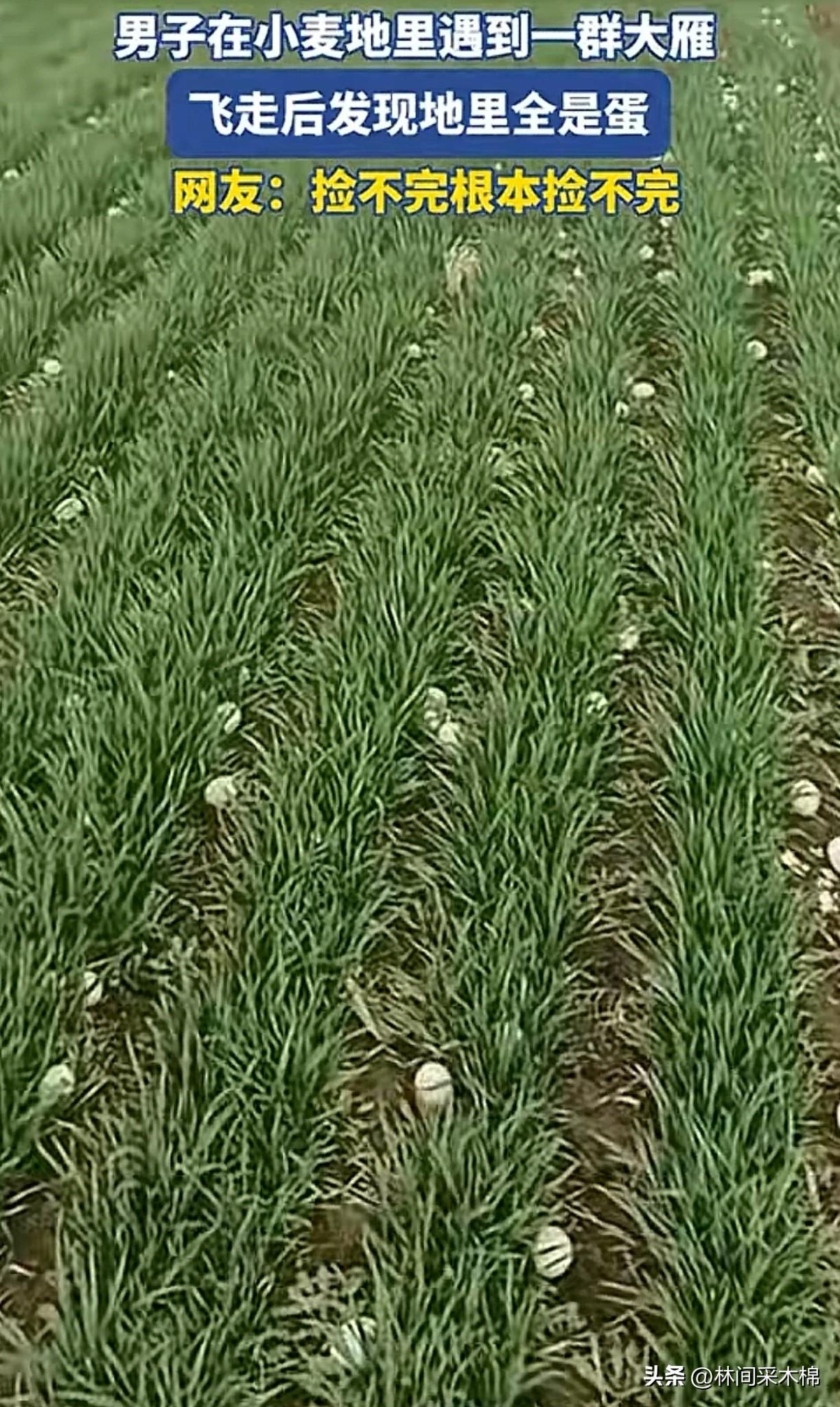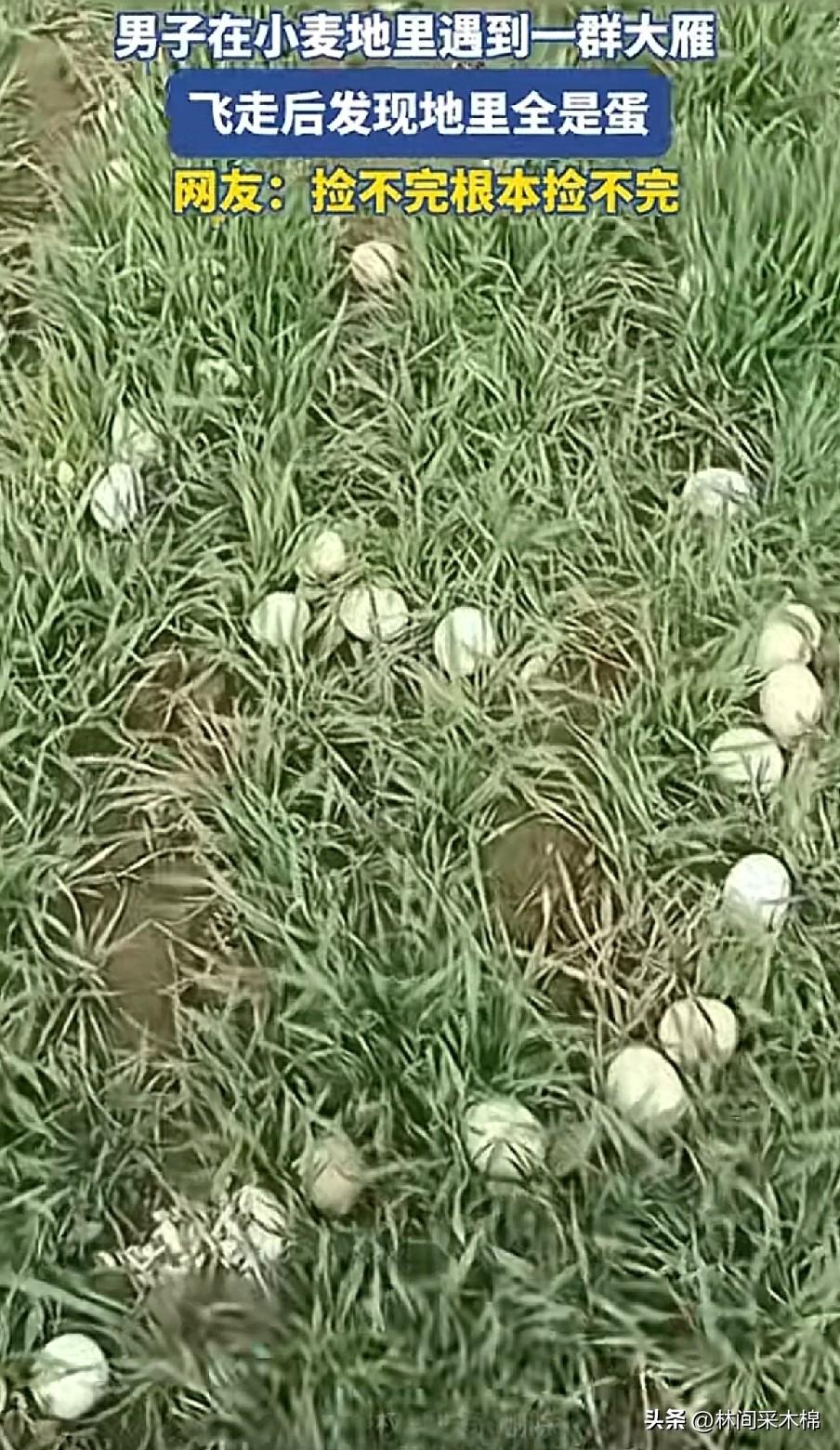 雁群离开后,男子靠近竟收获意外之喜!刚过完年,春天马上就要来了,河南一名男子在家闲不住,就去自家麦田里转悠。 远远看见碧绿的田里乌压压一片,男子定睛一看,竟是一群飞累的大雁在此歇息。感觉到有人靠近后,雁群忽扇忽扇翅膀陆续飞走了。 男子赶紧走向田里去检查麦苗有没有被大雁啄食。没想到竟看到满地的鸟蛋,男子惊呆了! 雁过留痕,大雁把它们最珍贵的蛋留了下来!