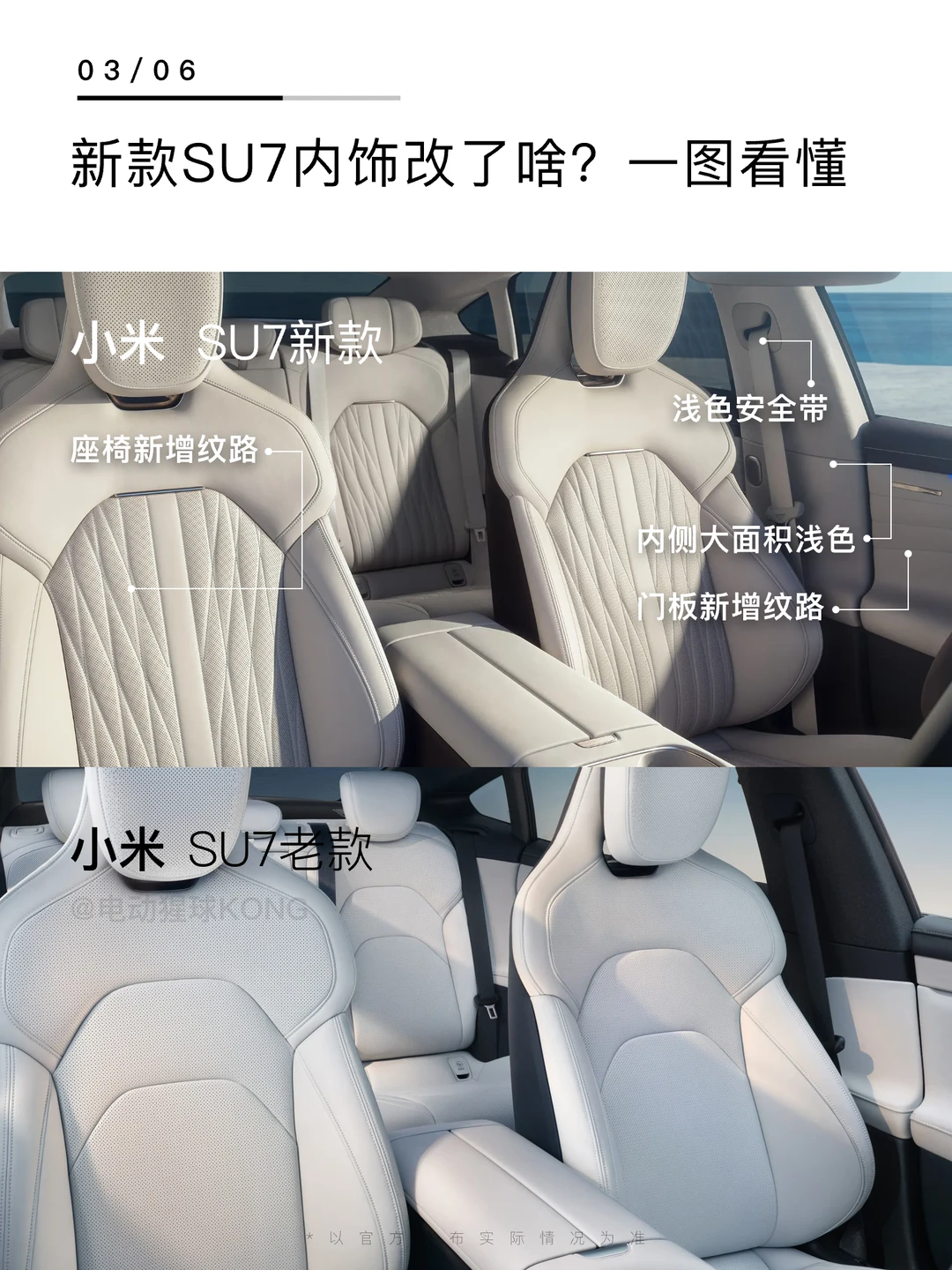 新款小米SU7内饰公布,中控扶手改动较大,浅色方向盘真可以,座椅和门板都增加了纹路。总体改动不大,细节处感觉更规整和精致了,你觉得改的怎么样?