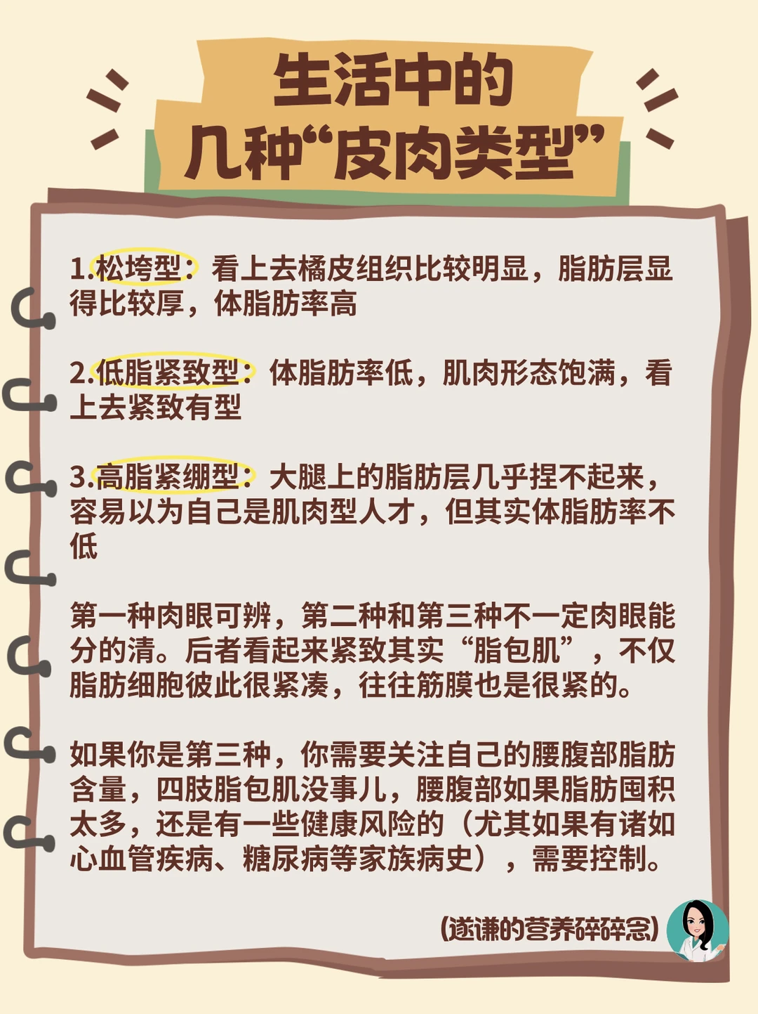 如果你是第三种,你需要关注自己的腰腹部脂肪含量,四肢脂包肌没事儿,腰腹部如果脂肪囤积太多,还是有一些健康风险的(尤其如果有诸如心血管疾病、糖尿病等家族病史),需要控制。