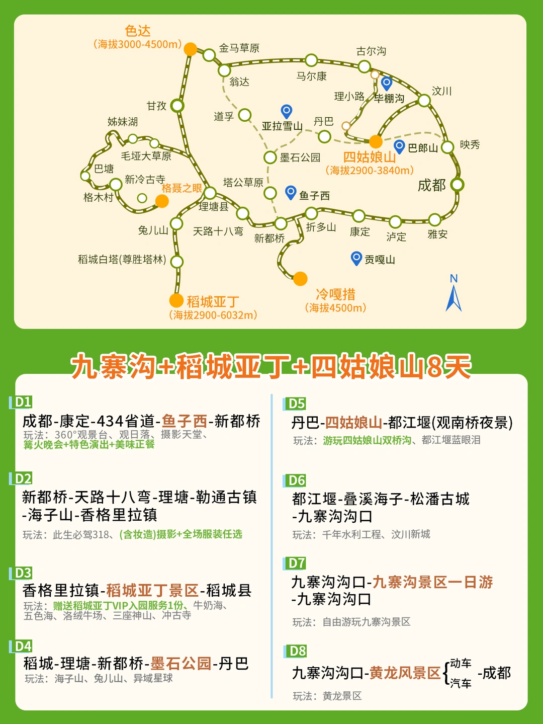 谁懂啊!川西真的美到让人失语😭 亲测2-8人纯玩小团,不用做攻略、不用拼车、全程0购物,懒人旅行直接封神! - ✨行程亮点✨ 🔹2-8人精品小团,随走随停,拍照自由,氛围超棒 🔹全程含早餐+特色正餐,不用AA司机餐费住宿费 🔹赠送成都酒店1晚+24小时接机接站,落地即享安心 🔹免费藏装旅拍,服饰任选,6张精修直接送 🔹稻城亚丁VIP入园+旅游三宝+便携氧气,轻松玩高原 🔹80W高额旅游险,全程安全感拉满 - 🗺️8天精华行程|不走回头路 D1:成都-康定-434省道-鱼子西-新都桥 👉 鱼子西360°全景看雪山日落,体验藏式篝火晚会 D2:新都桥-天路十八弯-理塘-勒通古镇-香格里拉镇 👉 打卡318此生必驾,沉浸式拍摄藏装大片 D3:香格里拉镇-稻城亚丁 👉 VIP免排队入园,徒步牛奶海、五色海,近距离仰望神山 D4:稻城-理塘-墨石公园-丹巴 👉 打卡异域星球墨石公园,途经兔儿山,住进藏寨风情 D5:丹巴-四姑娘山-都江堰 👉 畅游双桥沟美景,夜晚打卡南桥蓝眼泪绝美夜景 D6:都江堰-叠溪海子-松潘古城-九寨沟 👉 看千年水利工程,逛松潘古城,一路奔赴人间仙境 D7:九寨沟全天畅玩 👉 童话世界九寨沟,随手一拍都是高清壁纸 D8:九寨沟-黄龙-成都返程 👉 打卡人间瑶池黄龙,动车/汽车灵活返程,完美收官 - 🏨全程高品质住宿 ▪️成都1晚豪华酒店 ▪️香格里拉镇4.5钻品牌酒店 ▪️沿途舒适住宿,不降级、不将就 - 💰团费2398起|真纯玩·无隐形消费 不管是闺蜜出行、情侣旅行、独自旅游还是家庭出游都超合适 所有网红拍照点全部踩好,跟着走就能轻松出片📸 - 📌出行小Tips ▪️高原紫外线超强,防晒一定要做足 ▪️早晚温差巨大,厚外套、冲锋衣必备 ▪️提前准备红景天、氧气瓶,轻松应对高反 - 雪山、海子、草原、藏寨、神山、仙境湖泊… 川西所有浪漫一次集齐,全程专业向导带队,体验感直接拉满💯 想冲川西的宝子直接锁死这个小团!纯玩不踩坑,性价比超高‼️