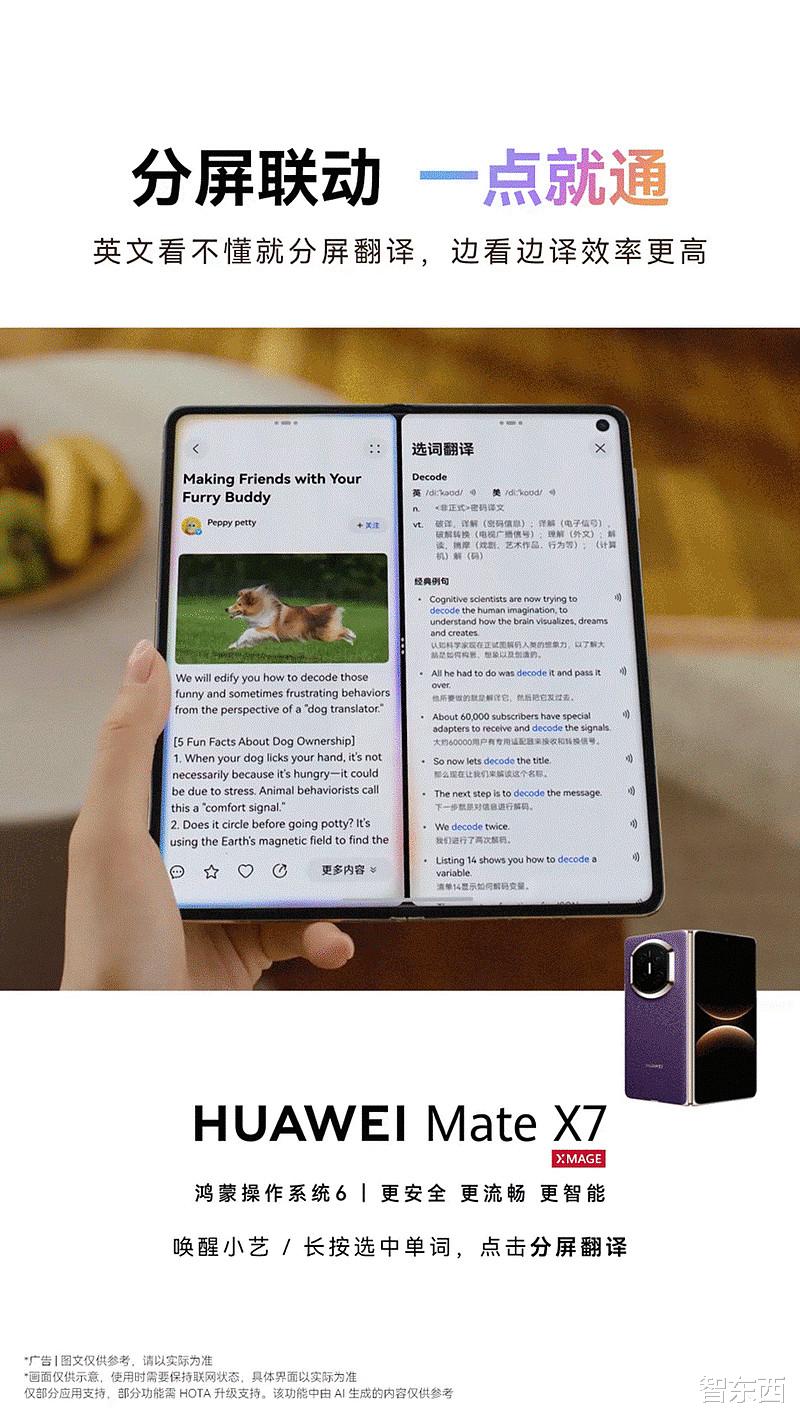 在交互上,华为Mate X7进一步强化了智慧分屏的协作能力,带来AI分屏联动体验。例如,浏览外文文章时可唤醒小艺进行翻译,系统会自动触发分屏,实现左右对照翻译,效率大幅提升;刷小红书看到心仪景点,可以一键生成导航,制作攻略更高效。这些由AI深度赋能的贴心功能,让华为Mate X7真正成为生活中的“效率助手”。