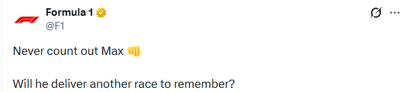 F1社媒:永远不要低估Max,他能否再奉献一场令人难忘的比赛