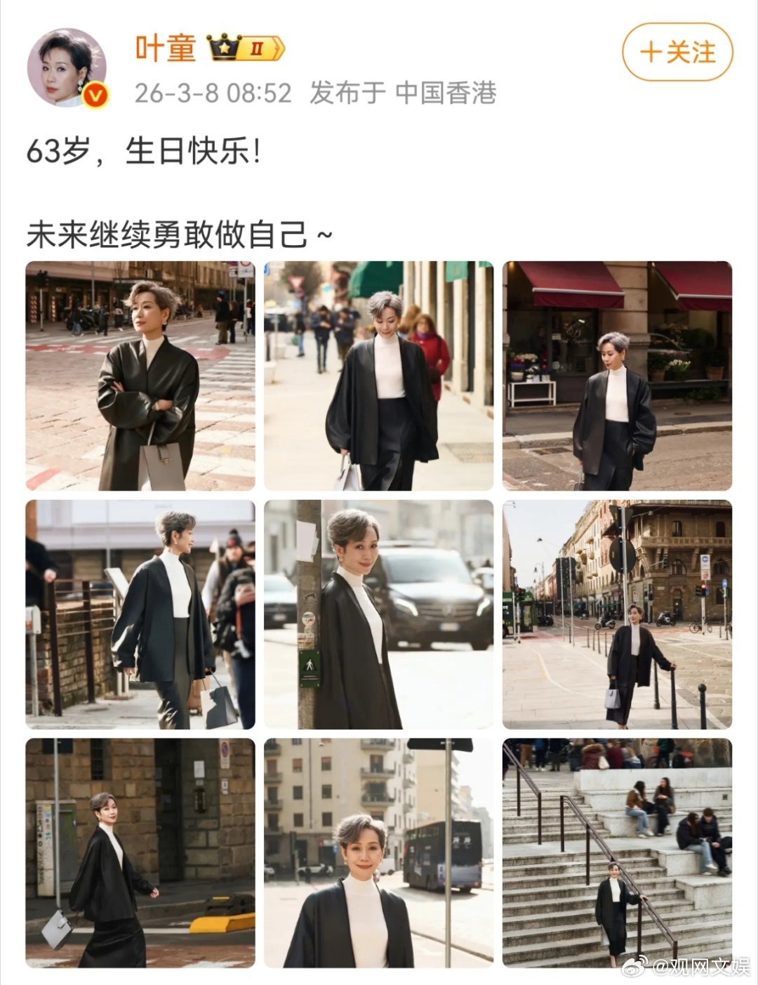 叶童63岁生日发博 3月8日,叶童发博庆祝自己“63岁,生日快乐!”,还表示“未