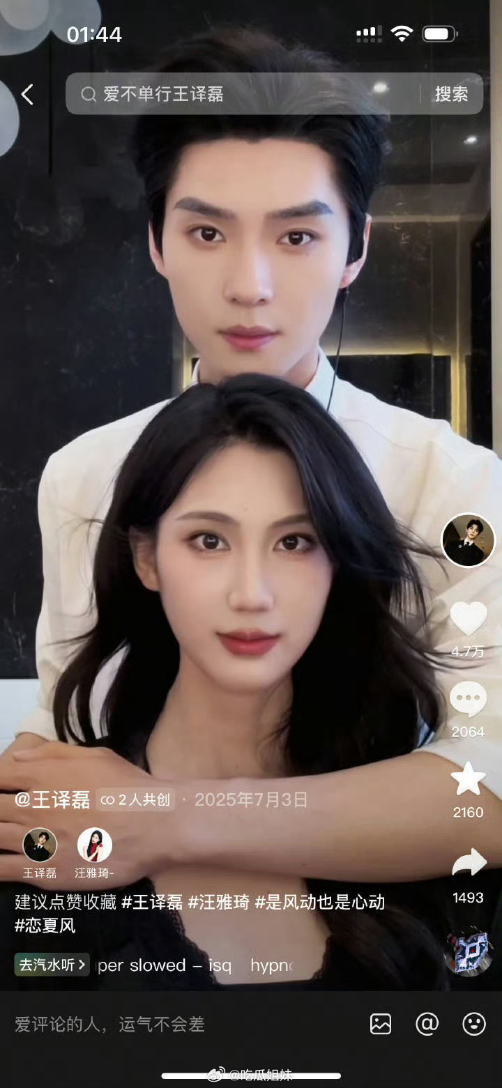 曝王译磊汪雅琦恋情 有网友曝短剧演员王译磊汪雅琦恋情,短剧演员爱谈已经不是什么新