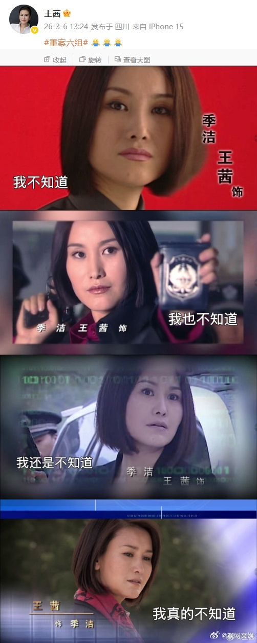 剧迷圈流传一句话——“流水的六组,铁打的季洁和老郑。”十年间,四部曲人来人往,女警季洁(王茜 饰)一直是灵魂人物,有观众称其全网无“代餐”,如果翻拍,当代演员里谁能挑起大梁?对于翻拍的消息,3月6日,原版编剧兼季洁扮演者王茜在微博晒出“我不知道”四连表情包做出回应。