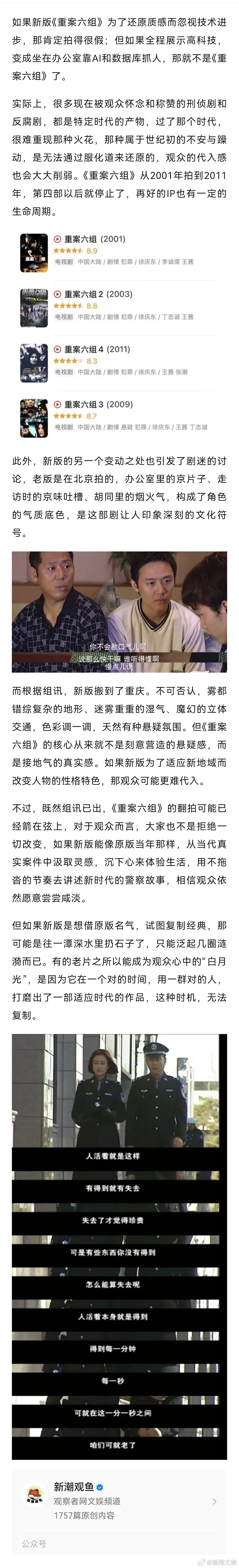 【冲上热搜!一听翻拍重案六组,网友炸了】重案六组翻拍能还原出硬核味吗近日,高分国产刑侦剧《重案六组》毫无预兆地冲上了热搜第一。第一部首播25年后,这一经典IP要被翻拍了。网传组讯显示“部分主要角色已定,其他大量角色未定”。消息一出,网友的第一反应不是期待,而是担忧,希望新版不要毁了他们童年的“白月光”。