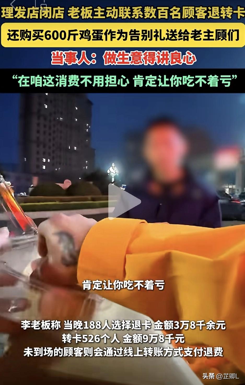 潍坊这家理发店火了!闭店不跑路,退钱还送600斤鸡蛋,这才是真良心! 3月2日,山东潍坊一家理发店要闭店,老板这波操作,直接把网友看服了! 别的店关门,要么失联跑路,要么找借口不退钱,这家老板反着来:主动联系顾客,愿退卡就退,愿转卡就转,一分钱也不坑人! 不光如此,老板还自掏腰包,买了整整600斤鸡蛋,当成告别礼送给老顾客,不管退不退卡,来了就领,太实在了! 老板总共有3家理发店,对于愿意转到另外两家店的顾客,老板给出了多给卡内余额的50%补偿的承诺! 当天一算账:188人选择退卡,退了3万8千多;526人选择转卡,一共9万8千多。没到现场的顾客,过后会挨个线上支持退款。 钱一分不少,态度还特别诚恳,这格局,谁看了不竖大拇指! 老板说,自己做美发5年,售后一直很到位:7天无理由换发色,30天免费维护,90天发质保障。 就一句话:做生意讲良心,人家花钱了,咱就得给人保障! 现在办卡最怕遇到关门跑路,钱打水漂。这位老板用行动告诉大家:诚信比啥都值钱,好口碑比赚快钱长久。 网友纷纷评论: “这才是正经做生意的人!” “必须给山东老板点赞,太敞亮了!” “要是所有商家都这样,谁还怕办卡啊!” “有责任心的店主,鸡蛋不是道别礼,是人品照亮下一个更好店面的破壳礼!” 小小的理发店,大大的良心。 为这样的实在老板点赞,祝他以后生意越做越红火! 素材来源:齐鲁晚报,侵联删!