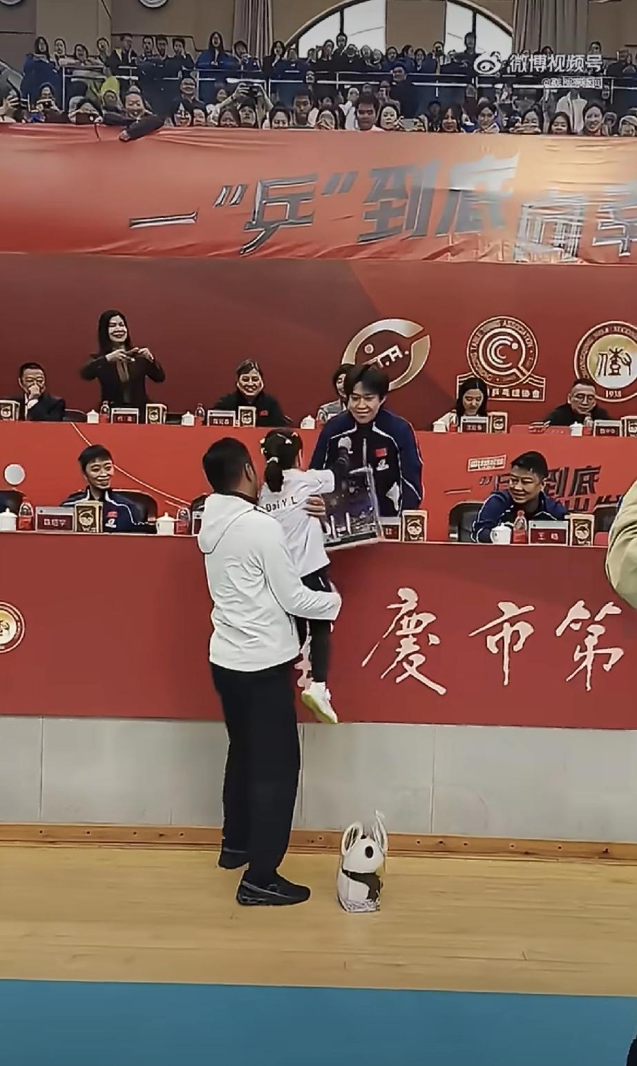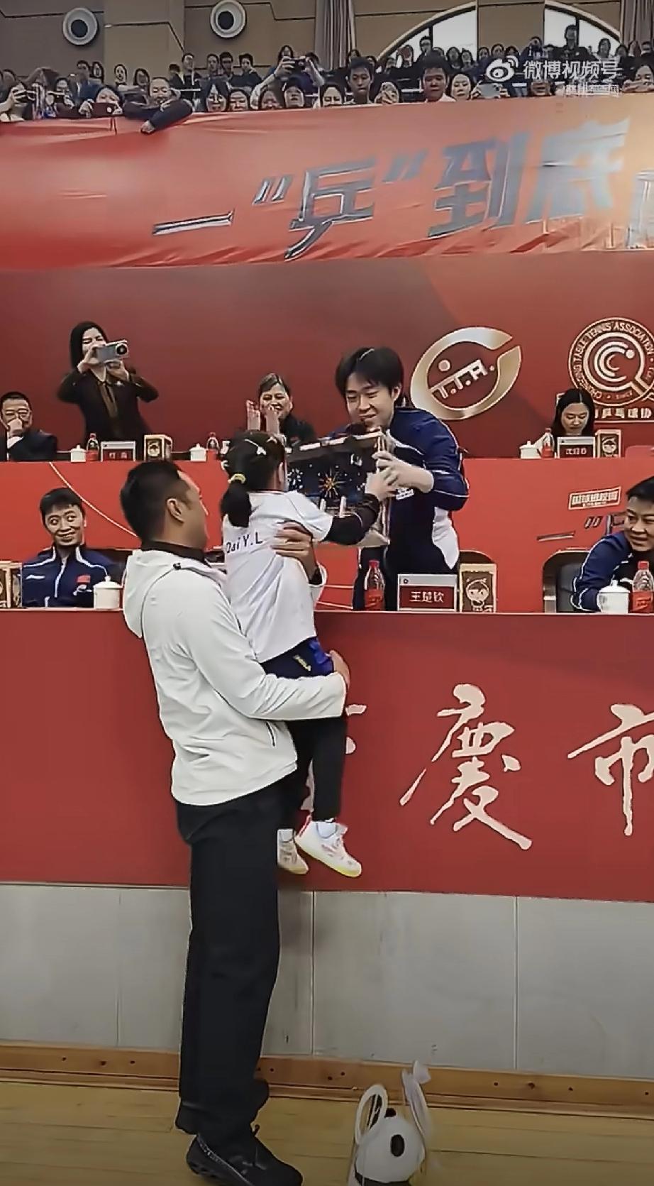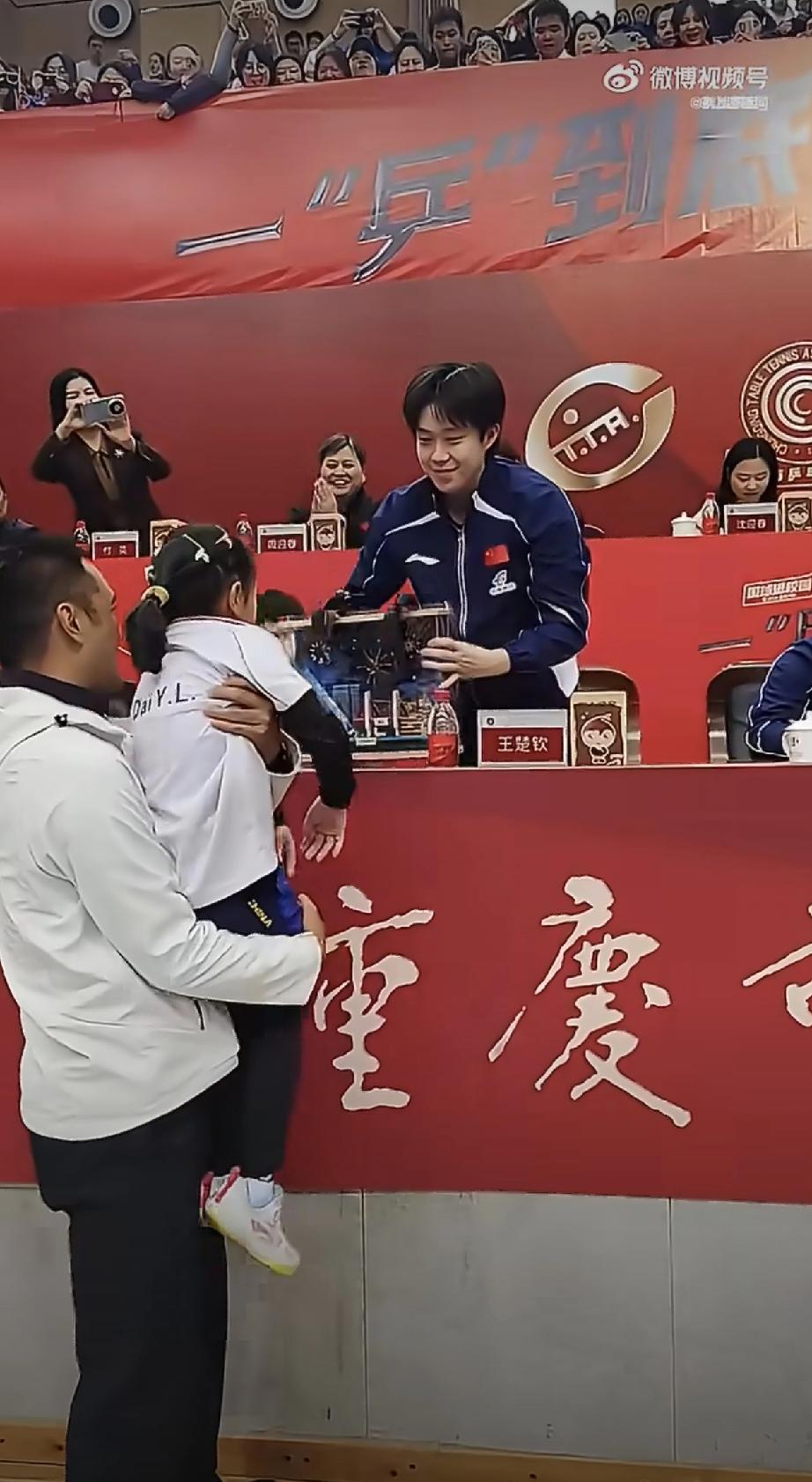 王楚钦又收到小球迷的礼物了[笑哭], 今天上午,王楚钦和参加2026WTT重庆冠军赛的教练和队友们一起来到重庆八中,开展国球进校园活动,活动过程中,一个小女孩两只手分别拎着两个袋子朝着王楚钦他们的座位跑来,原来她是给王楚钦送礼物的[赞][笑哭]。 一名工作人员看到后,抱住小女孩把礼物递给了王楚钦,王楚钦满脸笑意,赶忙起身,弯腰双手接过礼物,然后马上和小女孩握手。 原来,这个小女孩是一名乒乓球学员,叫戴意霖,她最喜欢王楚钦,得知王楚钦哥哥要来,特意买了一份重庆拼图,送给了王楚钦。 孩子的这个举动让旁边的王皓指导、队友陈垣宇、向鹏都和王楚钦一样开心。 和这个孩子一样,我也祝福国乒选手们获得好成绩!