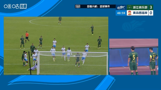 直播吧03月08日讯中超第1轮,浙江vs青岛西海岸。比赛第47分钟,米特里策前场任意球罚出,朴镇燮大力抽射被李昊扑了一下,球来到门前被刘浩帆笑纳破门。但VAR随后介入,主裁回看后认定刘浩帆手球,进球无效。