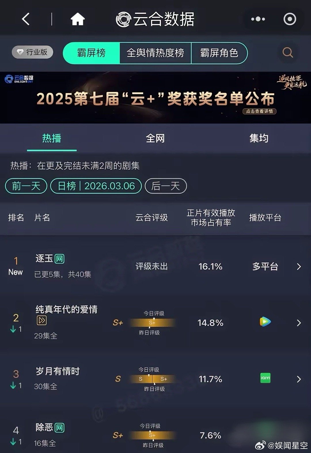 《逐玉》的各项数据可谓是来势汹汹啊!首日云合16.1%登顶,次日站内热度已经超过去年腾讯年冠《许我耀眼》和爱奇艺年冠《生万物》的次日热度。双平台破万指日可待。