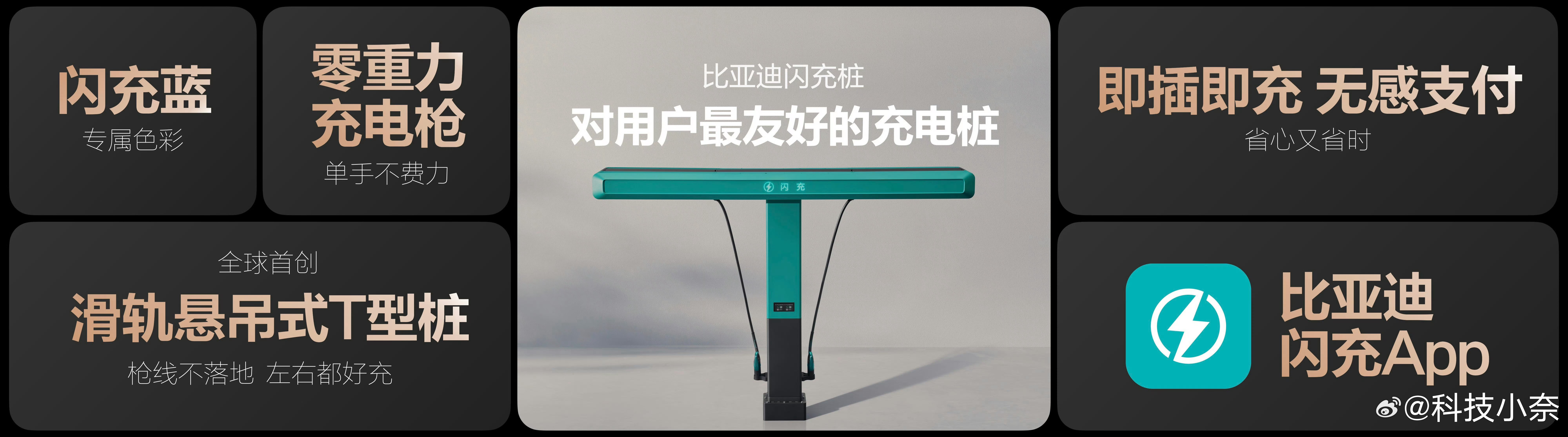 配套的闪充桩单枪功率达 1500kW,为全球量产最大功率,储充一体设计不冲击电网,多车同充功率不衰减。全球首创滑轨悬吊式 T 型桩打造零重力充电枪,枪线悬空不脏污、左右灵活适配,搭配即插即充 + 无感支付,彻底解决传统充电桩痛点。