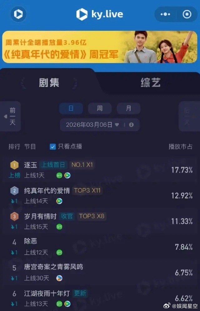 《逐玉》首播数据大爆!爱奇艺首播热度7901,26年第一,腾讯热度26519,26年第一,联播剧热度数据仅次于《与凤行》,首日云合即登顶,占比16.1%,首日酷云登顶,占比17.73,上一部首日云合登顶的剧还是《唐朝诡事录之长安》,云合播放量首日破3000万,上一部云合首日破3000万播放量的还是24年的《与凤行》,继《与凤行》和《庆余年2》万,第三部首日爆开的剧。