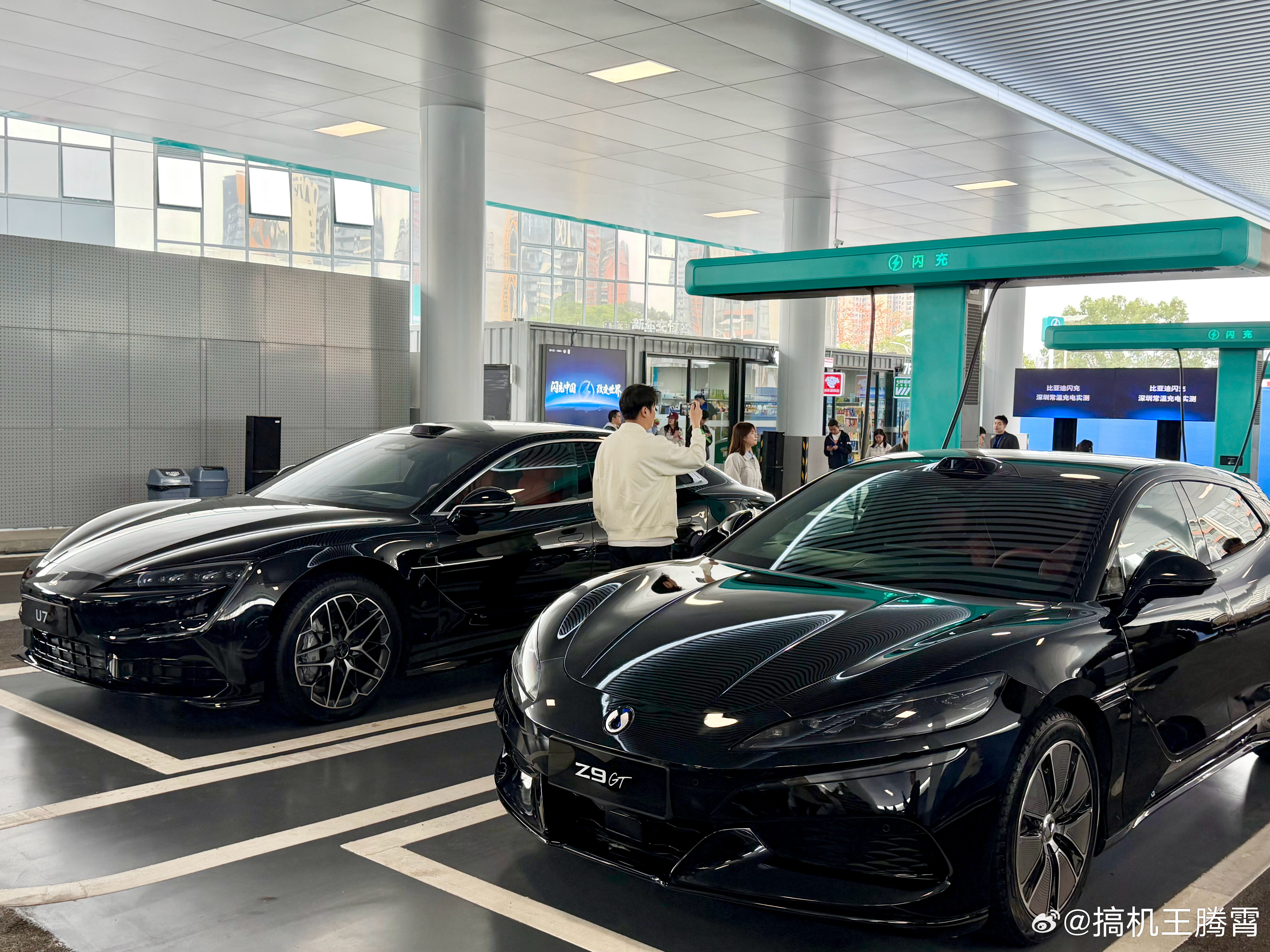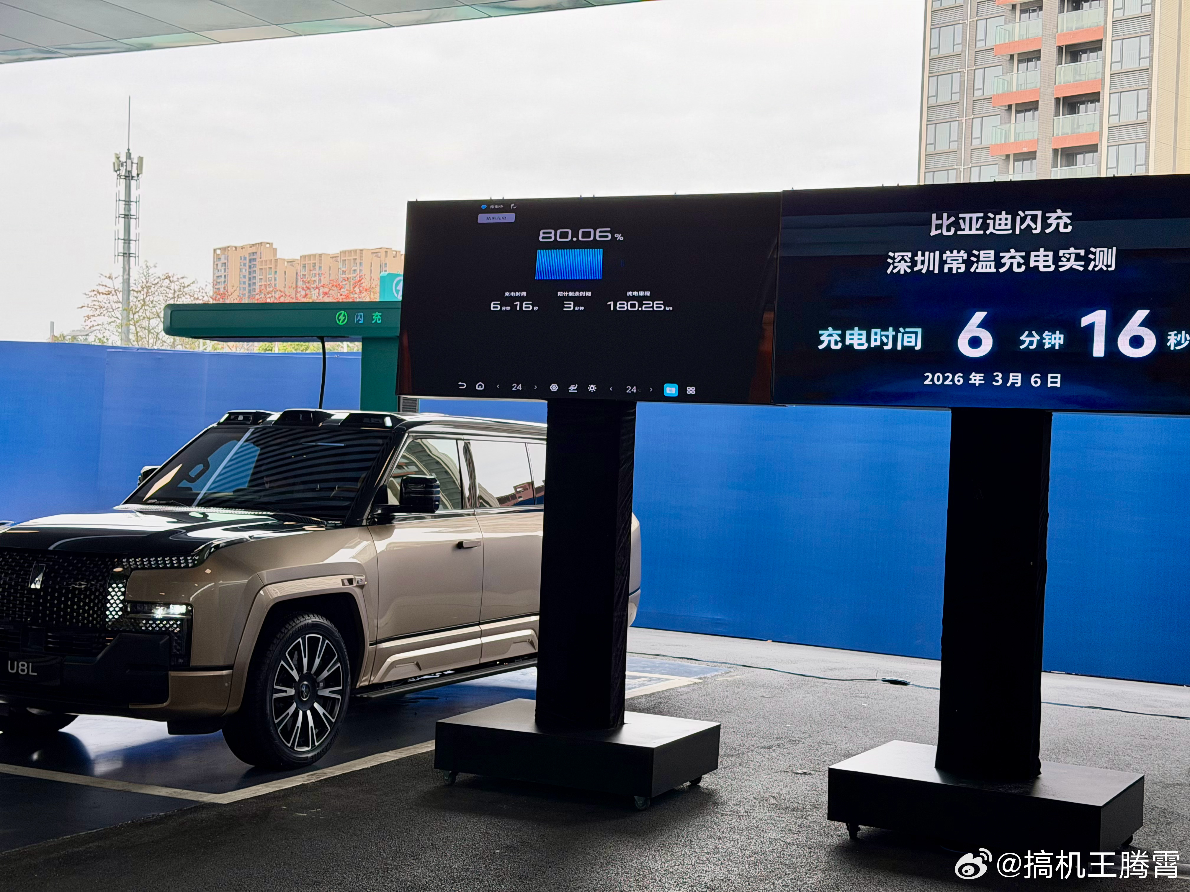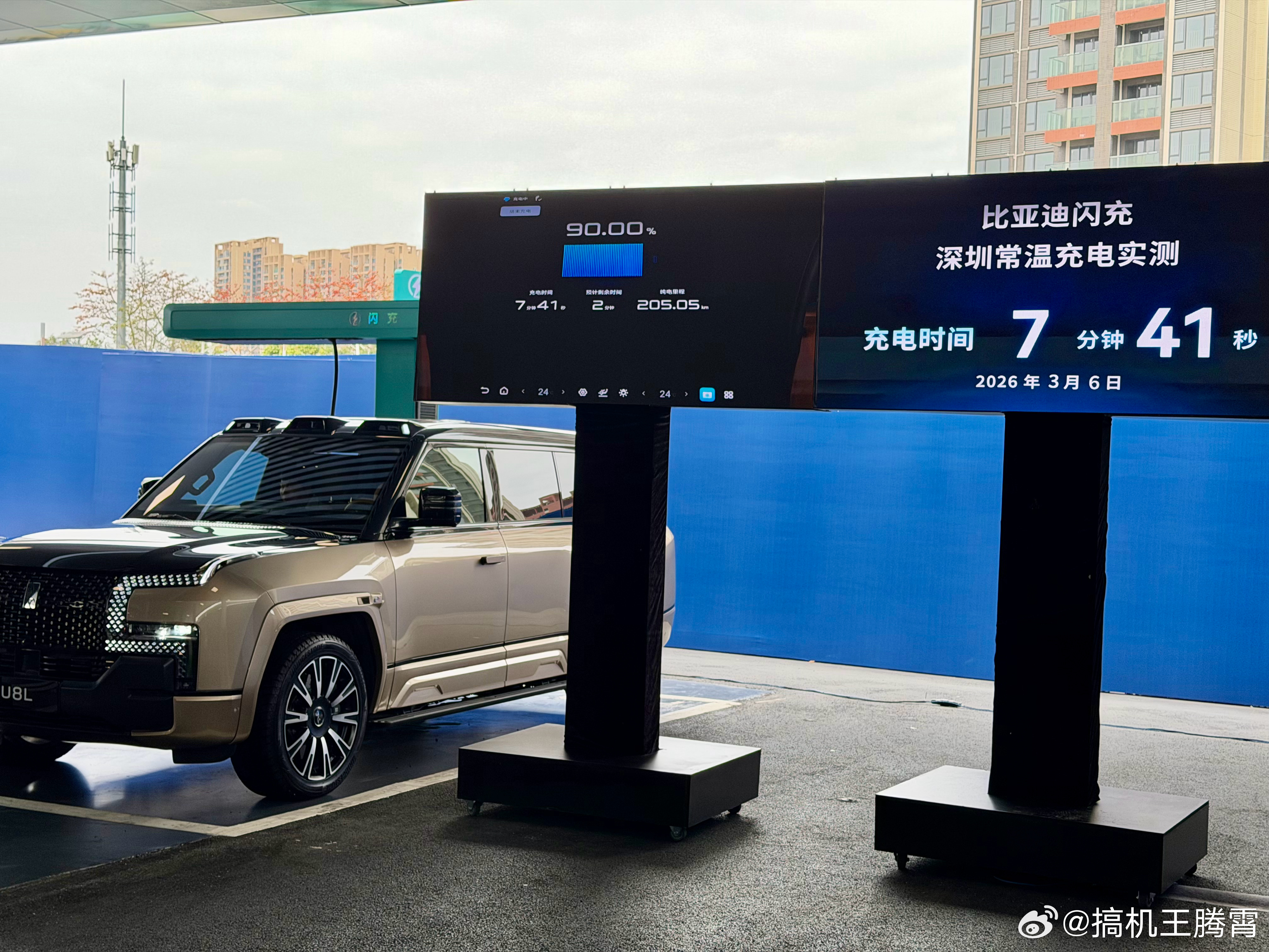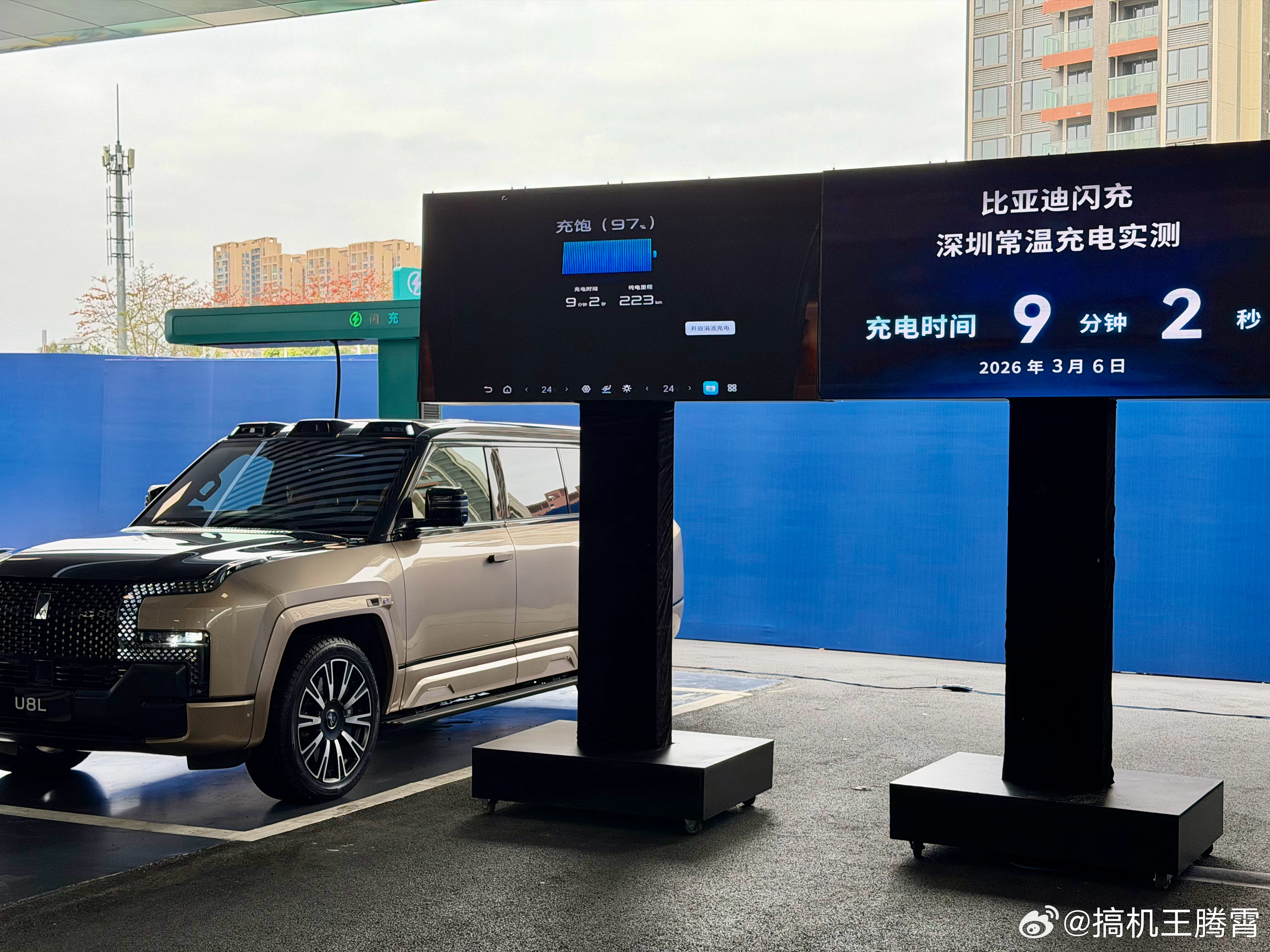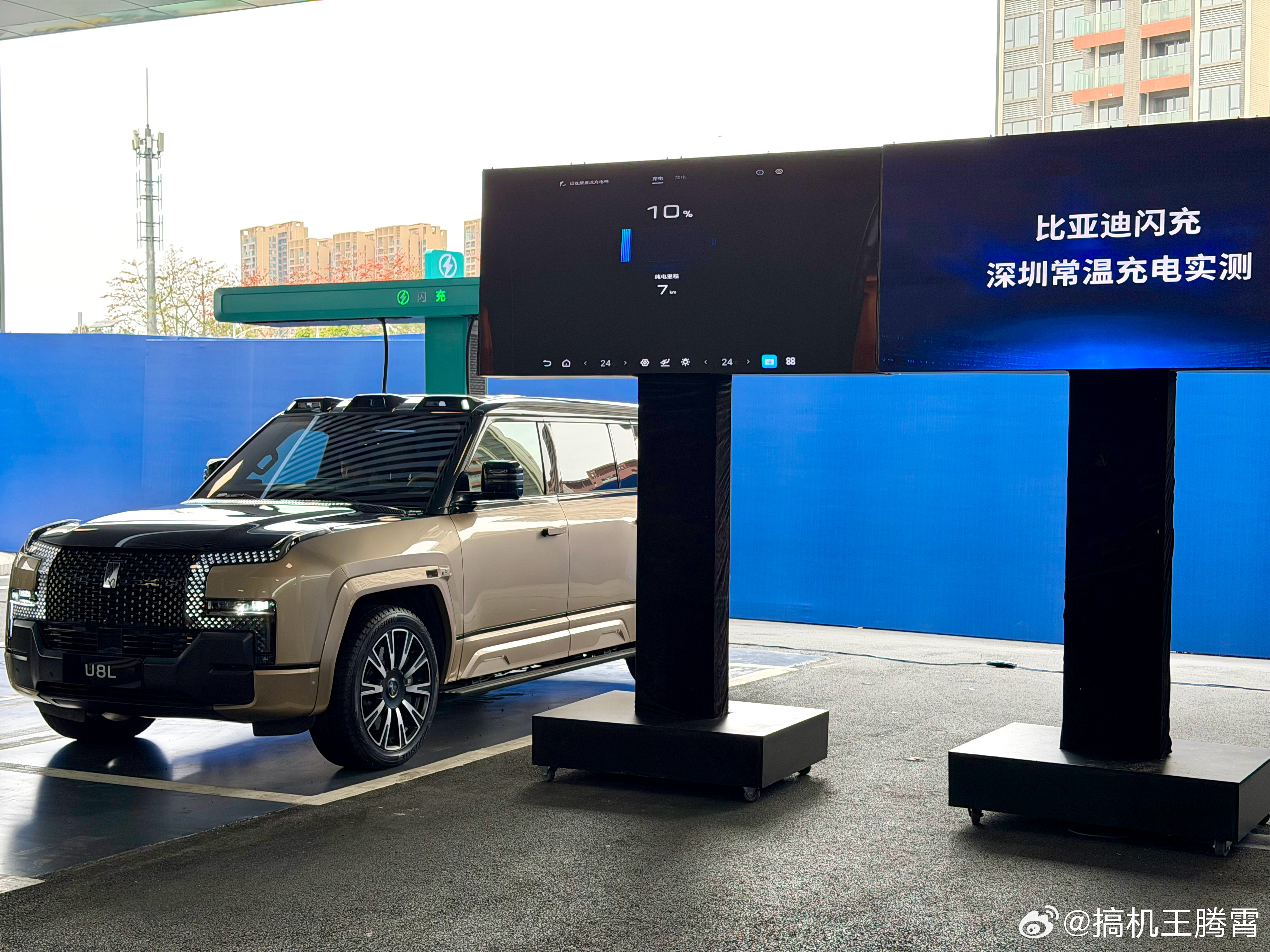 现场拿采用混动的仰望U8L和纯电的钛3来做测试,仰望U8L从10%电量(纯电里程7km)开始充电,4分7秒充到60%、6分16秒充到80%、7分41秒充到90%、9分2秒充到97%(纯电里程223km),除了充电快还有个最直观的感受,充电末期速度依旧坚挺,虽说现场看不到具体功率,但能明显感觉到功率不低。再来看纯电的钛3,仅用时8分46秒就充到了97%(纯电续航550km),由此可见无论纯电还是混动,9分钟左右都能充到97%。