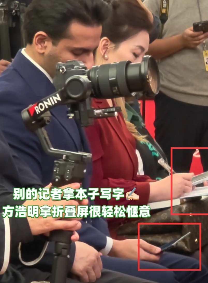 而且这回还带着一块折叠屏当提词板,眼尖的网友猜这可能是还没发布的OPPO Find N6?别的记者拿着本子写字,而他用折叠屏,对比真的很明显!据说N6几乎没有折痕,中国科技在进步哟~我们折叠屏真不比国外差!