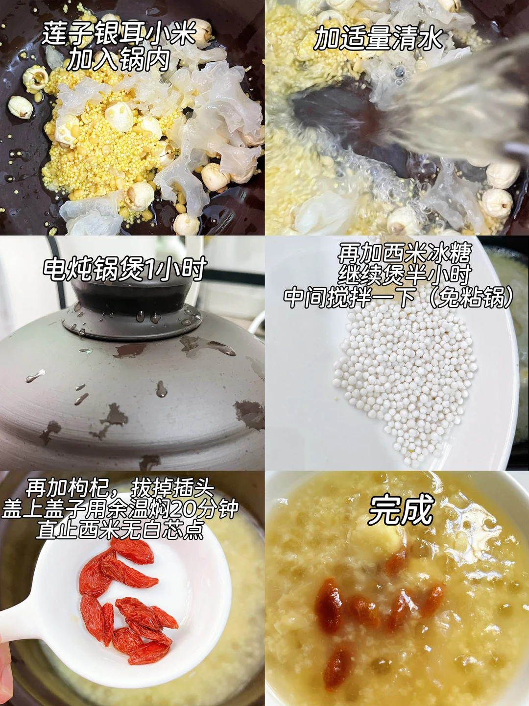 1️⃣ 莲子+银耳+小米入锅,加水煮1小时