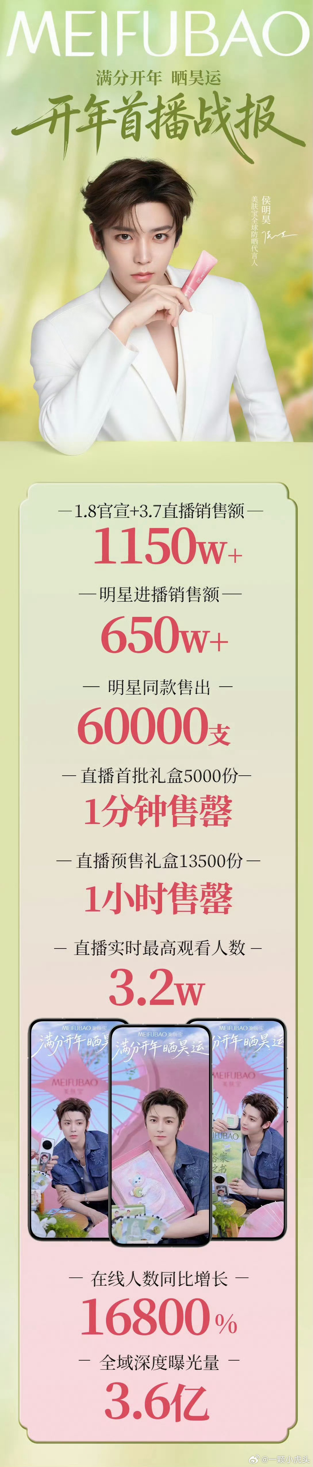 侯明昊MEIFUBAO直播战报,一分钟5000份259现货礼盒全部售罄,一小时18500份价值259的礼盒全部售罄!进播销售额650W+!不愧是开年就官宣了11个商务的爆剧生,是我们桃妹真金白银打下的江山!商务价值up⬆️👏