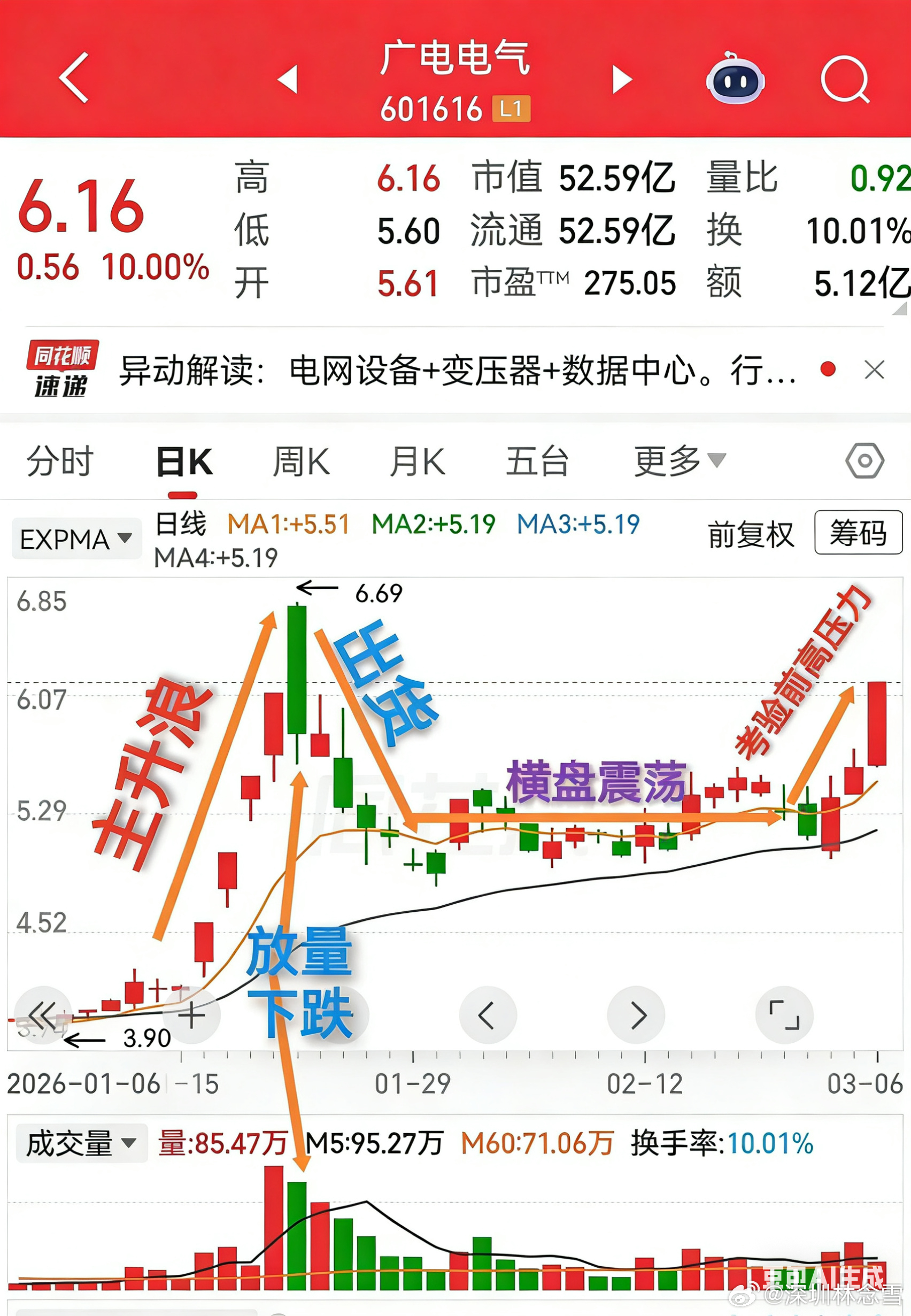广电电气前期四连板,之后长时间回调横盘震荡,这一波是跟随板块启动,股性与弹性不错。能否突破前高,需要继续观察量能与板块持续性,暂时以强势震荡思路对待。