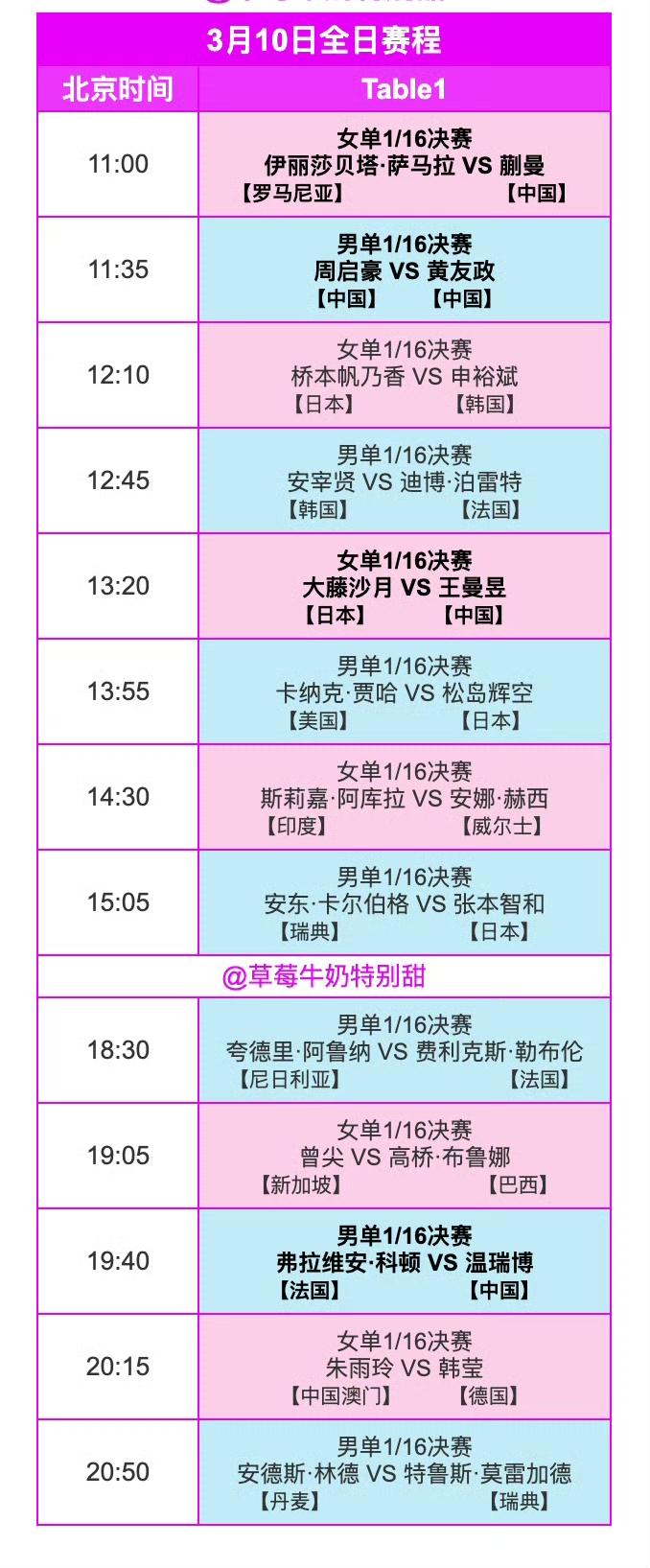 后天(3月10日,周二)赛程早早来喽[笑哭]! 2026WTT冠军赛重庆站3月10日中国队赛程如下图。 这是首轮1/16决赛,国乒的蒯曼🇨🇳、周启豪🇨🇳、黄友政🇨🇳、王曼昱🇨🇳、温瑞博🇨🇳都有比赛。 本站第一轮1/16决赛要打两天半,3月10 日一天,3月11日一天,还有3月12日的下午场,而孙颖莎的比赛又被安排在了最后半天即3月12日的下午场,不少球迷都诧异为什么总是给莎莎的比赛安排这么晚。 确实,这安排的真挺晚的,不过,每次莎莎也都克服了最晚比赛可能要承受的心理压力,几乎每次都夺冠了[笑哭]。 (感谢草莓老师的图片)
