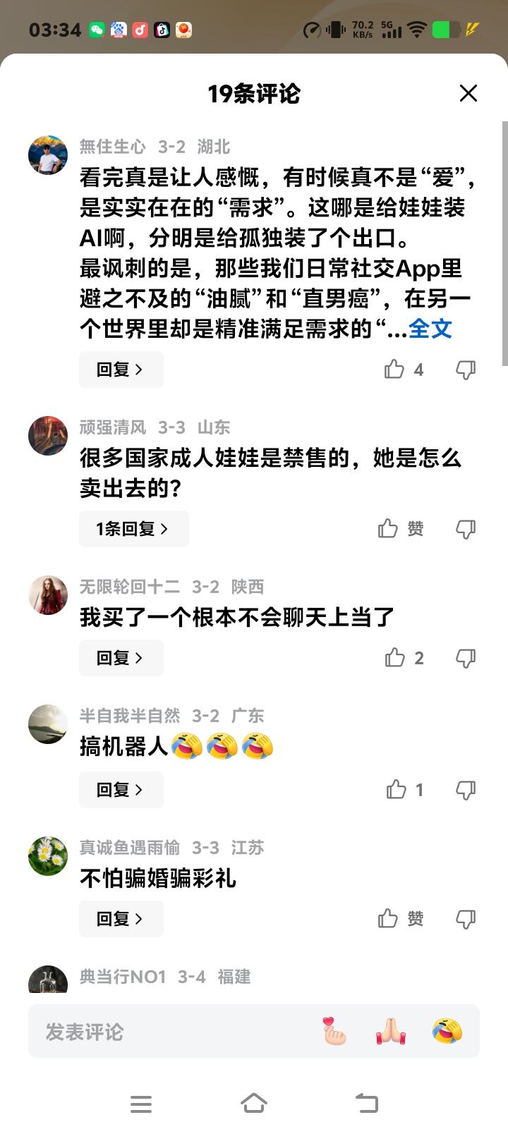 深圳南山区写字楼隐秘角落:他用AI让硅胶娃娃开口说情话,65岁老人日均聊天5小时,情感经济正在撬动千亿灰色市场 走进深圳南山那栋挤满AI精英的写字楼,你绝不会想到顶层的角落里藏着这样的秘密。没有高谈阔论的融资计划,只有此起彼伏的、令人脸红的测试声响。这里,AI技术正以一种最原始又最前沿的方式,重塑着人类最私密的需求。 李淋和他的团队,正悄悄将开源大模型塞进那些硅胶身体。一个成本百元的AI模块,让海外货架上的娃娃身价陡增百元美金。这不仅是技术的胜利,更像是一场关于孤独的精准生意。当触摸传感器埋入仿生肌肤,冰冷的硅胶突然有了“知觉”。 令人意外的数据浮出水面:付费用户中,竟有大量60岁以上的面孔。他们与AI娃娃的日均对话时长高达四五个小时,远超与远方子女的通话时间。性需求只是入口,深不见底的情感陪伴,才是真正粘住用户的黑洞。技术,在这里意外地抚平了时代的褶皱。 为了让娃娃“更像人”,李淋团队啃下了自然打断、记忆存储等硬骨头。用户可以为娃娃定制人格和声音,甚至创造共同记忆。一个内向的娃娃,会在相处中逐渐对你敞开心扉。这不再是单向的索取,而是一场精心设计的双向情感养成。 商业的想象力由此展开。硬件的一次性销售,变成了软件服务的持续收费。海外市场每小时5美元,国内市场10元人民币,用户为这份拟真的情感连接心甘情愿地掏钱。曾被资本冷落的赛道,因为注入了“情感”价值,正在变成流淌现金的活水。 然而,繁荣之下暗流涌动。数据合规的钢丝绳、不同文化的语言壁垒、“恐怖谷效应”的审美挑战,都是前行路上的地雷。更深的忧虑在于,当人类最脆弱的情感依赖被数据化和商业化,我们究竟是在解决孤独,还是在制造新的社会疏离? 巨头们并非没有嗅到商机,但李淋们凭借对垂直领域的死磕,暂时筑起了护城河。这个行业的私域属性和政策敏感性,让野蛮人难以轻易闯入。它就像城市夜色中一盏暖昧的灯,照亮特定人群,也划出了清晰的边界。 未来已来,只是分布不均。当我们在讨论具身智能的遥远蓝图时,在深圳的角落,最朴素的“具身”智能已经量产,并悄悄进入了全球数百万个家庭。它或许不够优雅,却无比真实地折射出这个时代,我们内心深处那份无处安放的、对“连接”的渴望。 (来源:《财经》报道及行业调研) AI情感经济 孤独生意