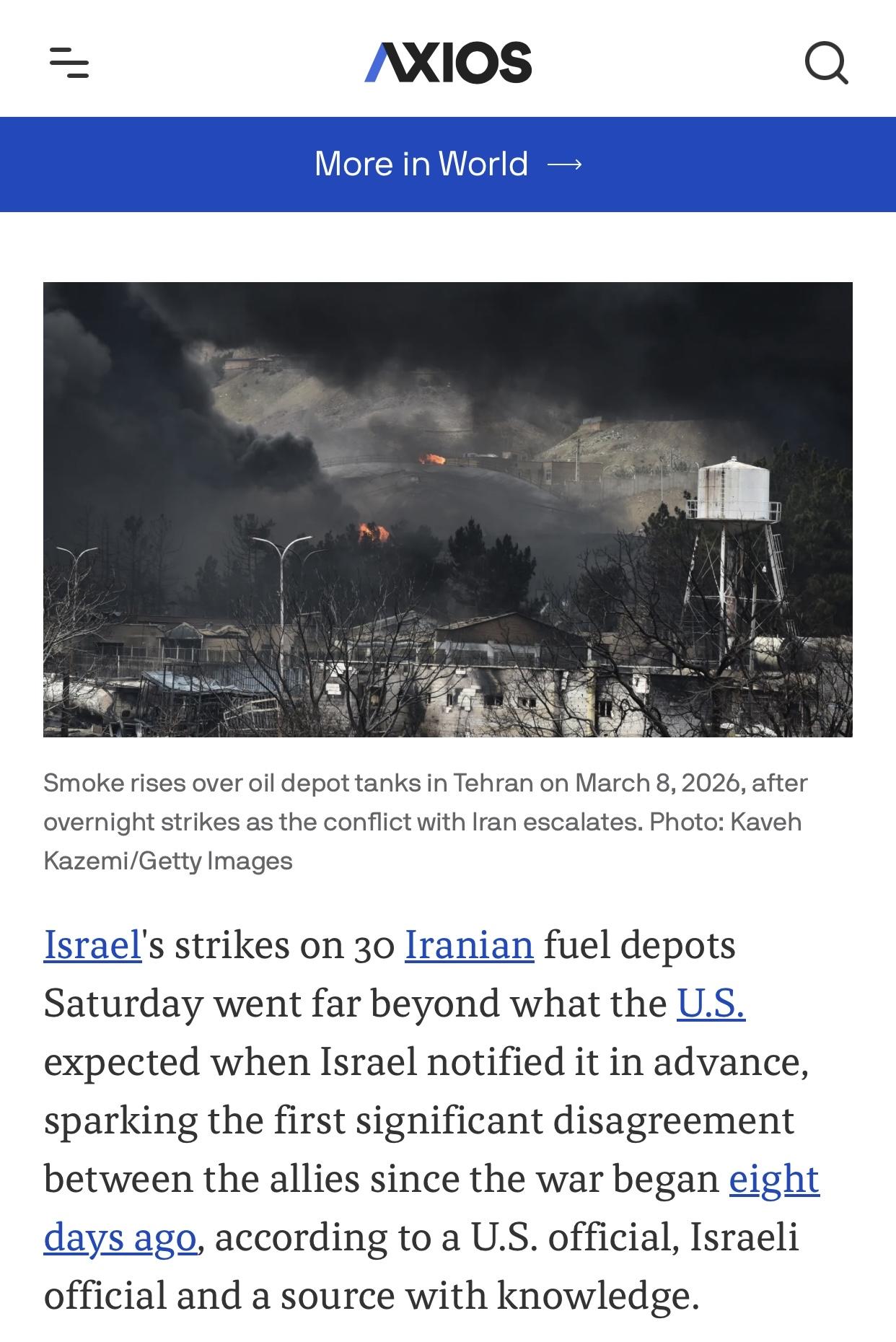 美媒独家:美国对以色列袭击伊朗油库感到不满和愤怒 美国媒体AXIOS官网当地时间3月8日独家报道:据一名美国官员、一名以色列官员和一名知情人士透露,以色列周六对30个伊朗燃料库发动的袭击,远远超出了美国在以色列提前通知时所预期的程度,引发了自八天前战争爆发以来盟友之间的首次重大分歧。 报道说,美国担心,以色列对为一般伊朗服务的基础设施的袭击可能会在战略上适得其反,动员伊朗社会支持该政权,并推高油价。 报道说,以色列空军上周六的袭击引发德黑兰大火,火焰数英里外可见,浓烟笼罩了整个首都。以色列国防军在一份声明中声称,这些燃料库“被伊朗政权用来向包括其军事机构在内的不同消费者供应燃料”。一位以色列军方官员声称,这些袭击部分是为了告诉伊朗停止针对以色列民用基础设施。 报道说,以色列和美国官员表示,以色列国防军在袭击前通知了美军。但一位美国官员表示,美国军方对他们的打击范围如此之广感到惊讶。一位美国高级官员说:“我们认为这不是一个好主意”。一位以色列官员表示,美国给以色列的信息是“WTF”(极为愤怒不满的意思—译者注)。 报道说,白宫和以色列国防军没有发表评论。 报道说,虽然遭袭击的设施不是石油生产设施,但美国官员担心,仓库燃烧的影片可能会吓着石油市场,并推高能源价格。 “总统不喜欢这次袭击。他想保留石油,不想烧掉它。而且这会让人们想起油价上涨”,一位特朗普顾问告诉Axios( "The president doesn't like the attack. He wants to save the oil. He doesn't want to burn it. And it reminds people of higher gas prices," a Trump adviser told Axios)。 报道说,一位美国官员表示,有关分歧及美国对战争的期望,预计将在两个盟友之间的高级政治层面上得到解决。 报道的原标题是《Scoop: U.S. dismayed by Israel's Iran fuel strikes, sources say》(独家报道:据消息人士称,美国对以色列对伊朗燃料设施的袭击感到沮丧)。
