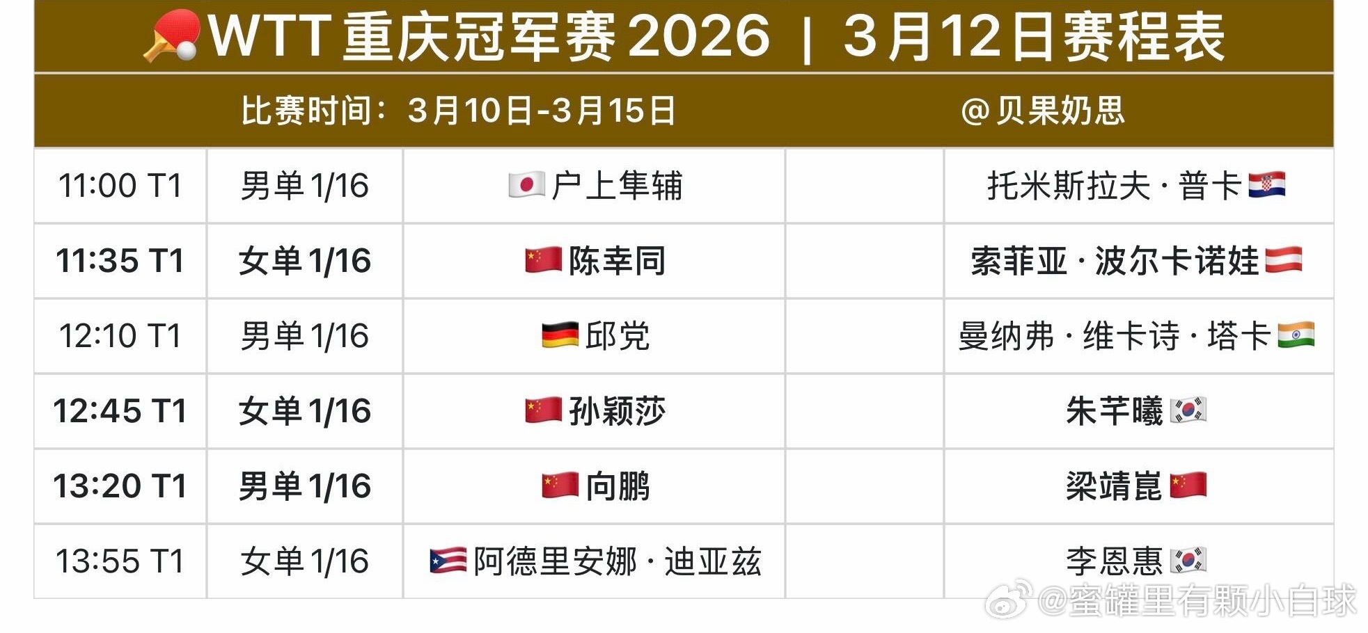 国乒重庆冠军赛首日赛程WTT重庆冠军赛 3月10日-12日中国队🇨🇳赛程【3月10日】11:00 🇨🇳蒯曼vs伊丽莎贝塔·萨马拉🇷🇴11:35 🇨🇳周启豪vs黄友政🇨🇳13:20 🇨🇳王曼昱vs大藤沙月🇯🇵19:40 🇨🇳温瑞博vs弗拉维安·科顿🇫🇷【3月11日】12:10 🇨🇳陈熠vs金娜英🇰🇷13:55 🇨🇳王楚钦vs约纳坦·格罗特🇩🇰18:30 🇨🇳王艺迪vs汉娜·高达🇪🇬20:15 🇨🇳陈垣宇vs雨果·卡尔德拉诺🇧🇷20:50 🇨🇳石洵瑶vs袁嘉楠🇫🇷【3月12日】11:35 🇨🇳陈幸同vs索菲亚·波尔卡诺娃🇦🇹12:45 🇨🇳孙颖莎vs朱芊曦🇰🇷13:20 🇨🇳向鹏vs梁靖崑🇨🇳晚场将进行1/8决赛WTT重庆冠军赛1天倒计时
