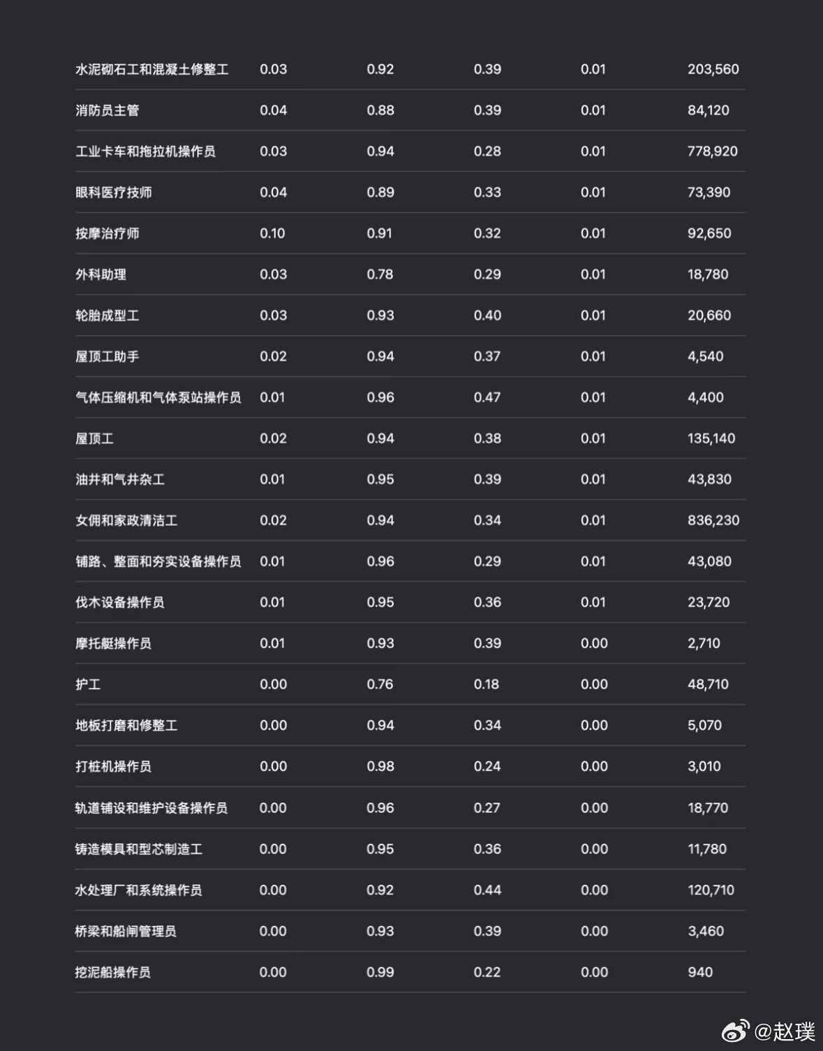 整体看下来,一些看起来体面的工作被AI代替了,反而像油漆工:洗碗工、护工等费力的工作需要人来做。