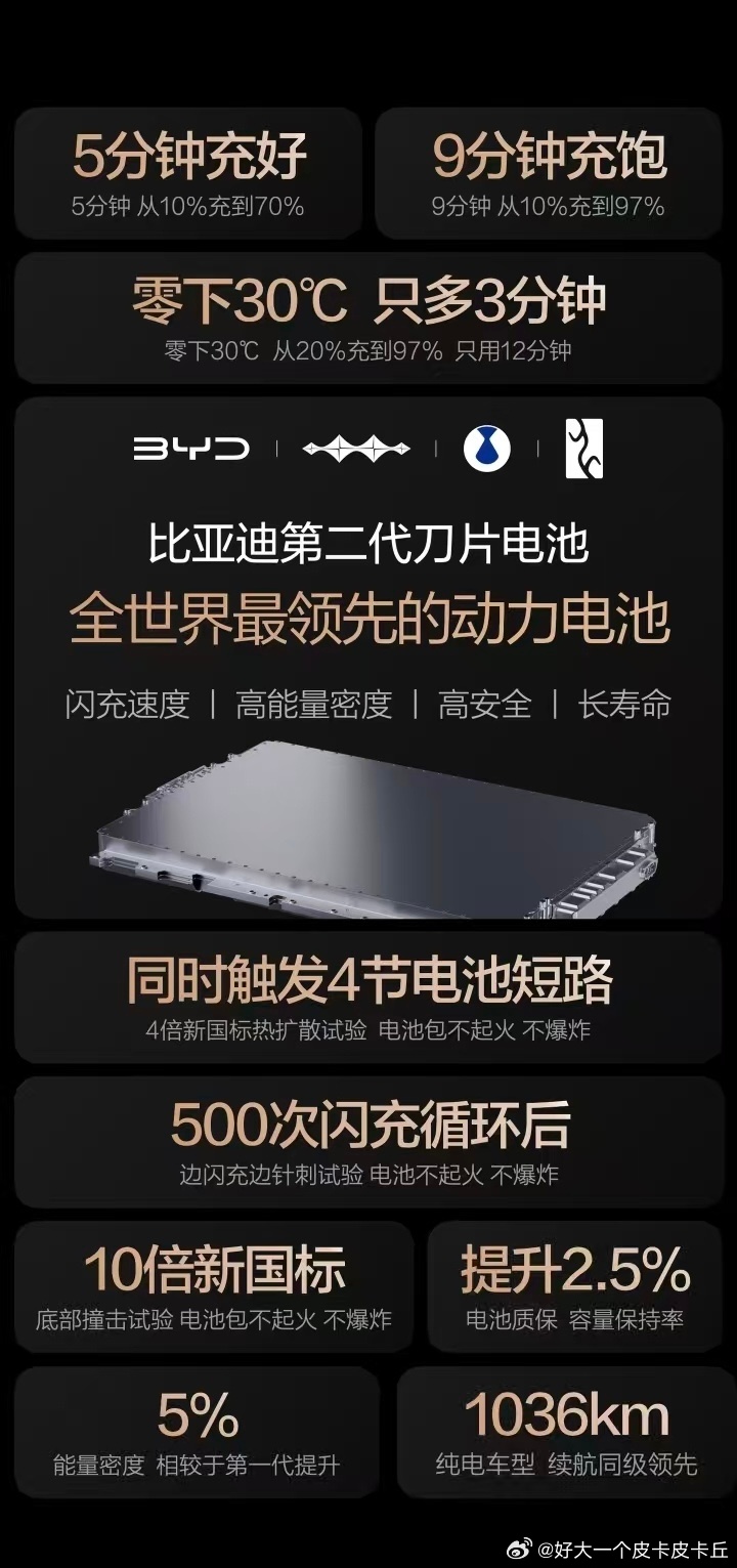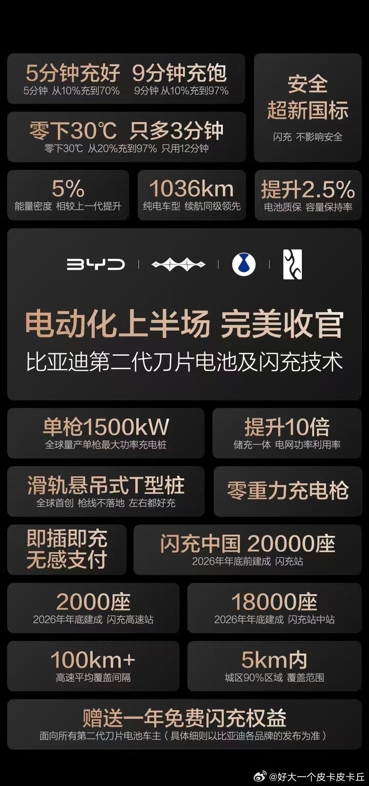 硬核闪充技术树立行业新标杆,中国新能源汽车产业再掀创新浪潮!3月5日,比亚迪震撼发布第二代刀片电池与闪充技术,以划时代的充电速度,为全球新能源补能领域树立全新里程碑。其闪充技术实现“常温5分钟极速补能、9分钟满电出发”,一举打破量产充电速度纪录,即便在零下30℃的极寒环境下,充电时间也仅延长3分钟,彻底终结低温充电难题,让新能源出行再无后顾之忧。为推动这项技术快速普及,比亚迪同步启动“闪充中国”战略,规划在年底前建成2万座闪充站,构建起覆盖全国的极速补能网络。其独创的1500kW单枪闪充桩,配备超级储能系统,既能有效保护电网稳定,又能确保多车同时充电时速度不衰减。全球首创的“滑轨悬吊式”充电设计,让充电操作如“零重力”般轻松便捷,配合“即插即充”与无感支付功能,极大提升了用户体验。此外,比亚迪还为闪充车主提供1年免费充电权益,以实际行动降低用户使用成本。从技术突破到生态布局,比亚迪正以全方位创新重新定义公共充电体验,引领全球新能源出行进入“闪充时代”。比亚迪第二代刀片电池充饱9分钟比亚迪引领新能源汽车迈入闪充时代