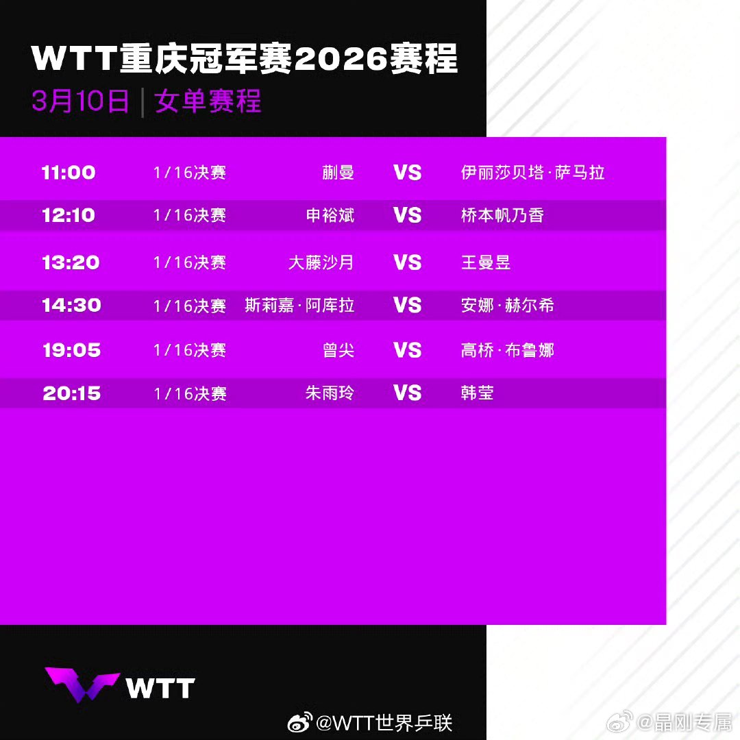 国乒重庆冠军赛首日赛程WTT重庆冠军赛1天倒计时WTT重庆冠军赛首日赛程来了:11:00 蒯曼vs萨马拉;11:35 周启豪vs黄友政(上演国乒内战);13:20 王曼昱vs大藤沙月;19:40 温瑞博vs科顿;