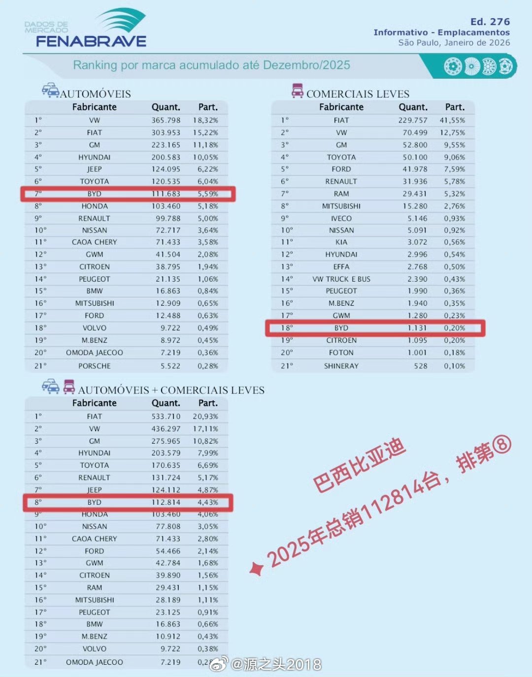 2025年,比亚迪巴西销量112814台;如本年度25万台目标达成,则2026年销量将同比增长约121.6%,本年度巴西国内排名将坐四望三!