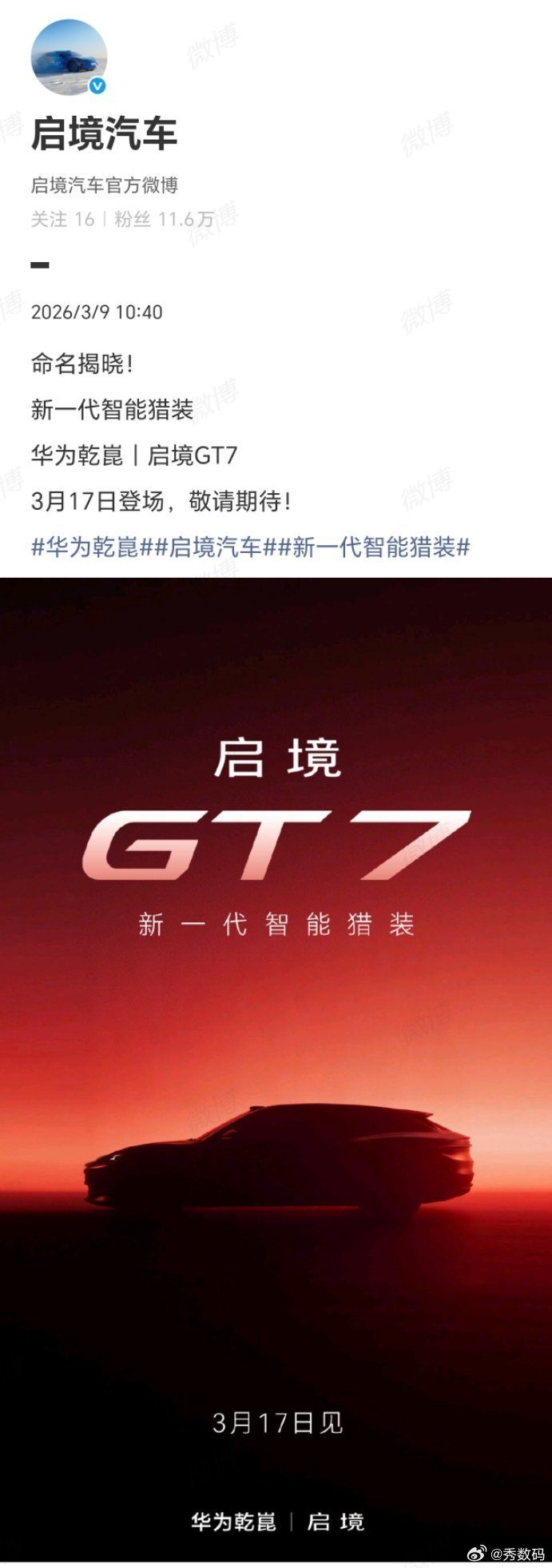 对了,还有广汽三电技术与华为乾崑全栈智能技术强强联合,带来越级的驾乘体验,入门即高配的实力太圈粉!3月17日新车正式发布,期待值直接拉满!启境官宣首款车型命名GT7