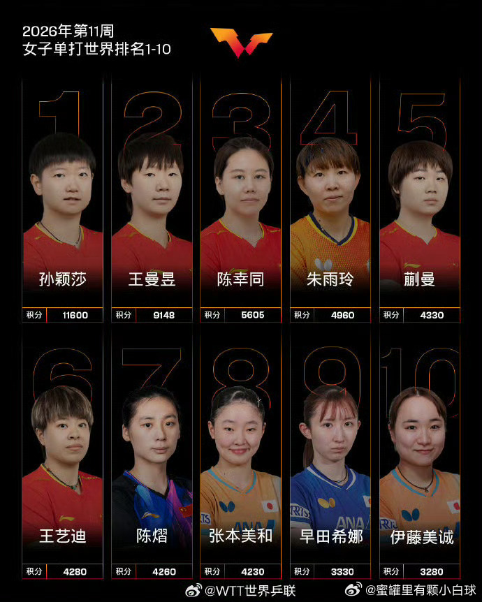 女单前十:孙颖莎位列第一,王曼昱第二、陈幸同第三三,蒯曼第五,王艺迪第六,陈熠第七。