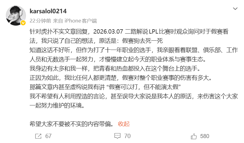 虎扑03月09日讯今日Karsa更新社媒,回应网上关于假赛的相关传闻,具体如下: