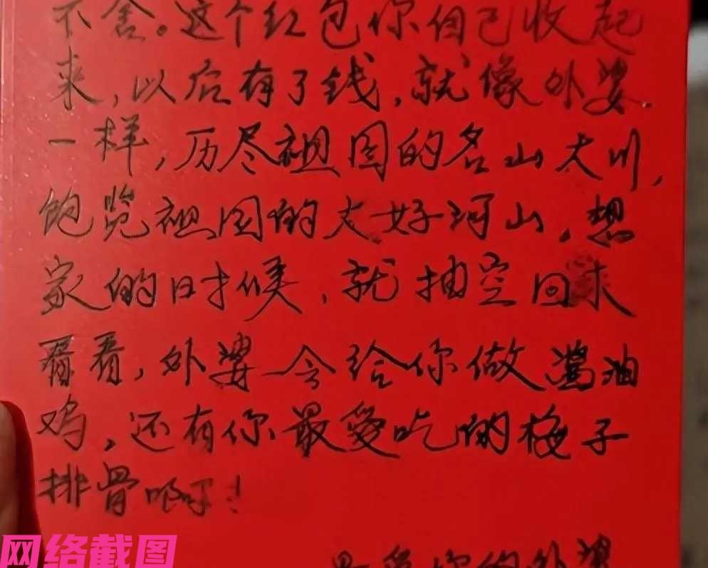广东有女子年后准备要离家,在收拾自己的衣物时,看到行李箱内有自己外婆的两个红包,这背后还写满字。 此刻女子看着眼前两个红包也是诧然,女子打开一个看到里是大小不一的现金,第二个却是一封写满字体的书信,全是女子外婆念叨的家常话,希望女子好好生活,看看美好的世界,常回家看看,外婆为她做她爱吃的酱油鸡和梅子排骨。 看着自己手里的红包书信女子感动落泪,这里外婆是对她的关心还有牵挂,在女子心里的情感也见得带着对于外婆的感激,此刻她是无比的幸福,看她无论在哪里,外婆对她的挂念永远没有放下,信里外婆话语朴素,情感至臻。 这里全见得是长辈们对于晚辈的爱,以她们眼里的爱意,在自己的行为举止里散落,让晚辈们可以真实体会到她们心怀的寄望与支持,这样的絮叨看得人心满满的暖意,有些感动,也有着满怀的希望。