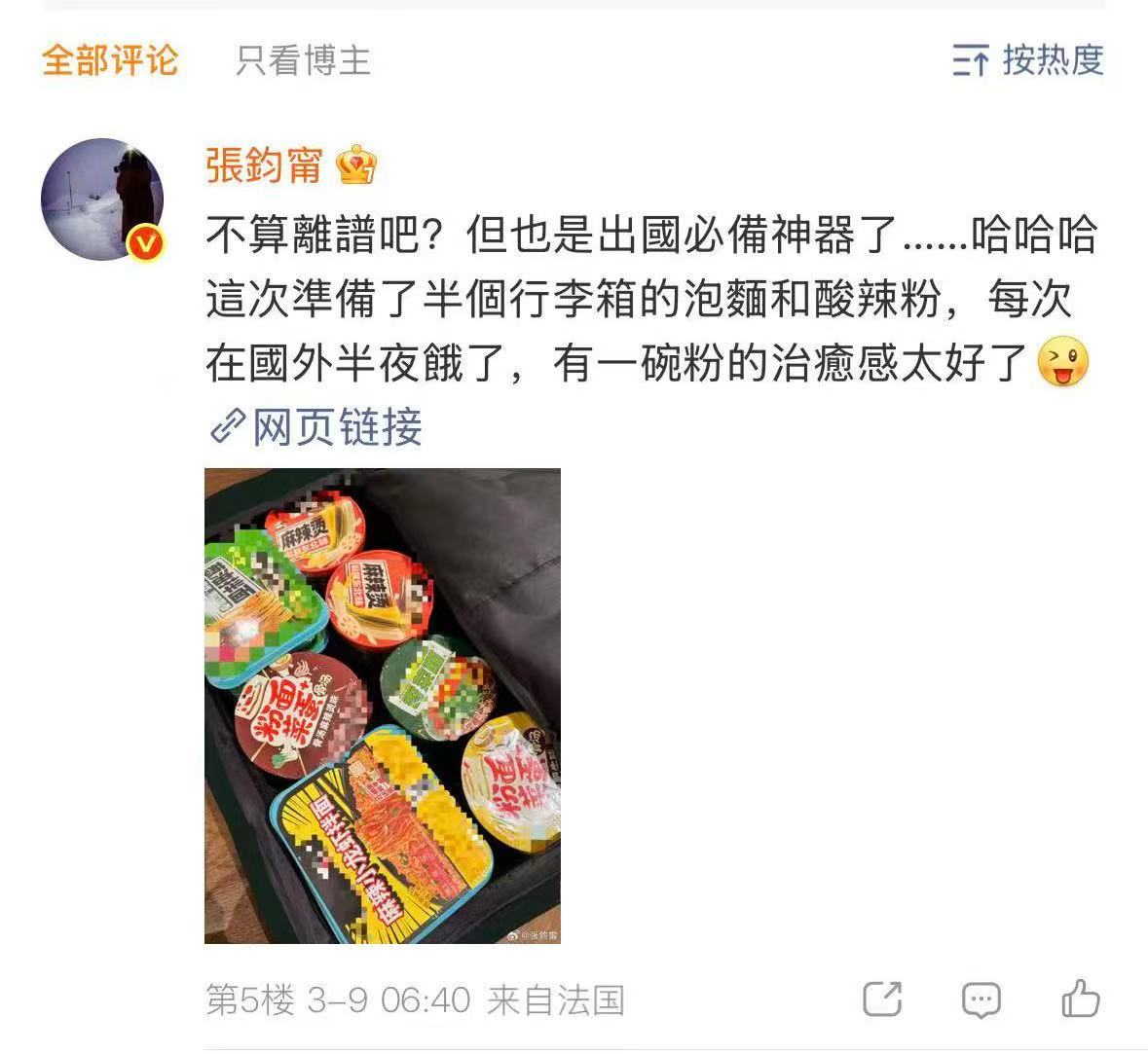 张钧甯去巴黎带了半行李箱泡面 塞纳河畔左岸的咖啡,不如行李箱右半边的泡面配火腿,好想问问姐姐到底哪款比较好吃!也期待姐姐的闪亮亮相哇。