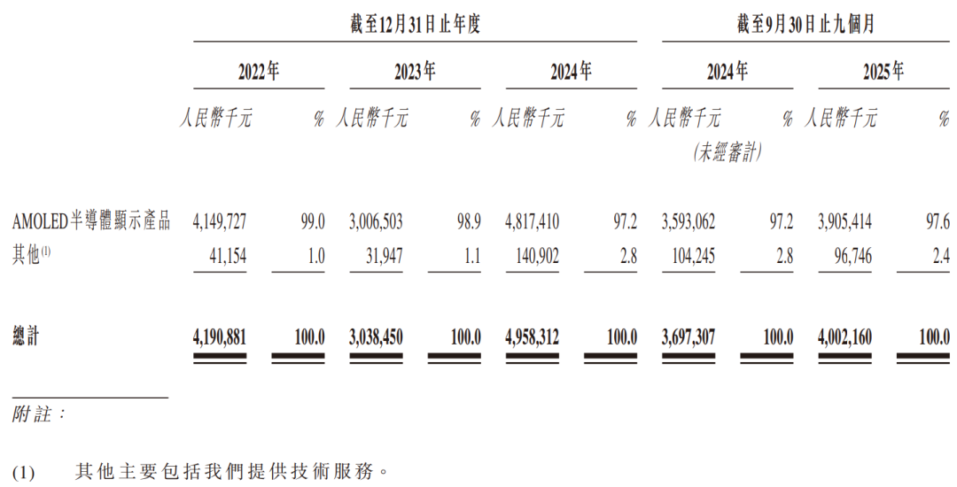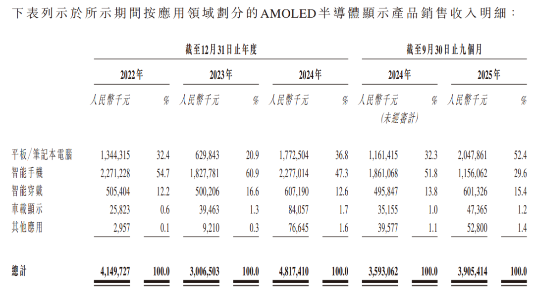 公司的收入主要来源于AMOLED半导体显示产品的销售,占各期总营收的97%以上,其中平板/笔记本电脑、智能手机是核心应用领域,2024年两者合计贡献了84.1%的产品收入。