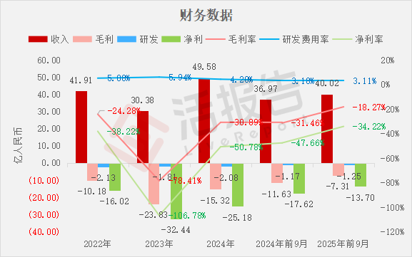 毛利分别约为人民币-10.18亿、-23.83亿、-15.32亿、-11.63亿、-7.31亿,2025年前9月同比-37.14%;