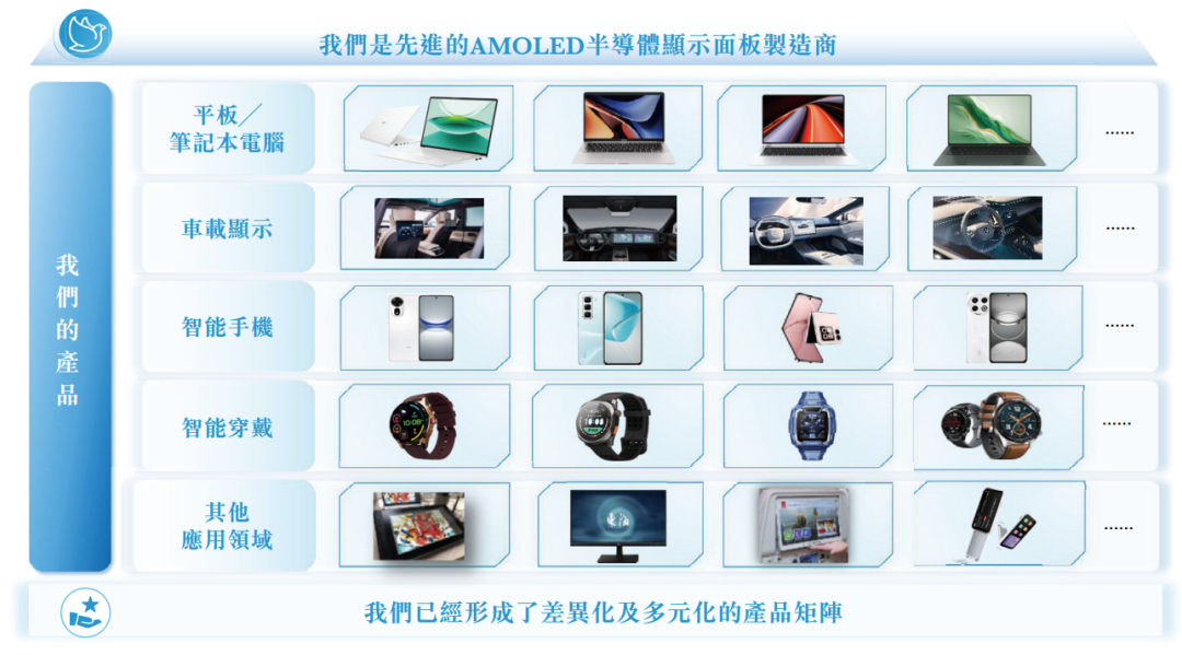 公司坚持「刚柔并济」的战略,具备生产刚性、柔性及HybridAMOLED显示面板的能力,能够流畅切换以根据规格生产不同产品。亦推出了可折叠及曲面显示面板等创新产品,以紧跟行业趋势及满足客户需求。