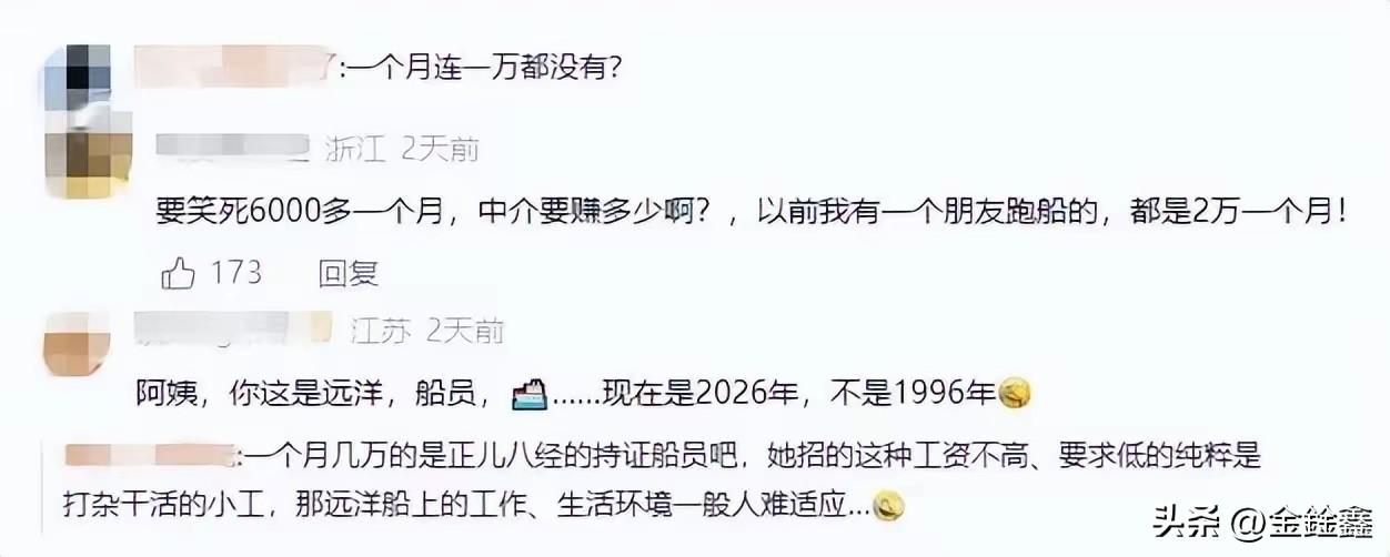 2年狂赚16万?宁波渔船招聘刷屏:包吃住,50岁也要! “包吃包住,有钱也花不出去!”近日,一则宁波船员招聘信息火遍全网,引发数万网友热议。招聘方直言:不需要文化和技能,年龄到五六十岁都没关系,只要身体吃得消,两年保底就能拿16万! 这听起来像“天上掉馅饼”的好事,究竟是什么来头?据宁波多家船务公司发布的招聘信息显示,此次招聘主要针对远洋金枪鱼船和鱿鱼船的普通船员。岗位要求极低:不限学历、不限经验,甚至明确表示“晕船也没关系,80%的人都会晕,适应了就好”。对于渴望攒钱的中年劳动者来说,这无疑具有巨大诱惑力。 然而,高薪背后是常人难以想象的艰辛。远洋捕捞意味着两年不上岸,茫茫大海上,不仅要忍受晕船呕吐、风吹日晒,还要面对枯燥封闭的工作环境。正如网友所言:“钱是好钱,但这罪不是一般人能受的。” 这并非骗局,而是一份用汗水和离别换来的辛苦钱。它折射出的,是底层劳动者对美好生活的朴素向往,以及就业市场上“苦差事”与“高回报”的残酷平衡。 信息来源:今日头条、宁波晚报、奉化人才网