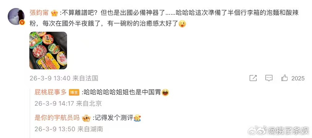 张钧甯去巴黎带了半行李箱泡面 不管飞多远,中国胃永远不变!张钧甯半箱泡面直接把安全感拉满,太接地气了。